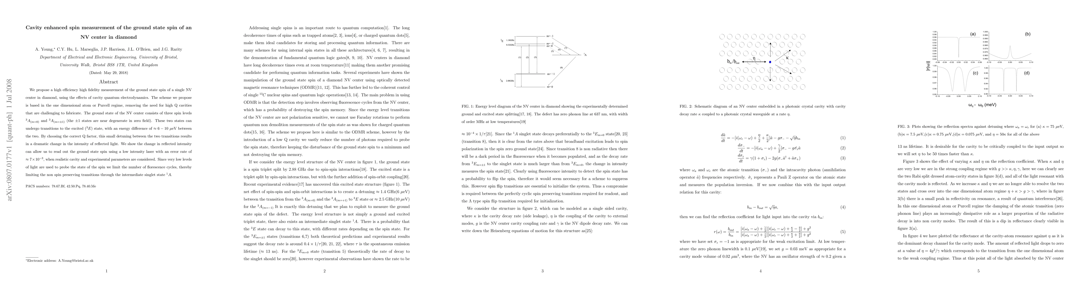 We propose a high efficiency high fidelity measurement of the ground state spin of a single NV center in diamond, using the effects of cavity quantum electrodynamics. The scheme we propose is based in the one dimensional atom or Purcell regime, removing the need for high Q cavities that are challenging to fabricate. The ground state of the NV center consists of three spin levels $^{3}A_{(m=0)}$ and $^{3}A_{(m=\pm1)}$ (the $\pm1$ states are near degenerate in zero field). These two states can undergo transitions to the excited ($^{3}E$) state, with an energy difference of $\approx7-10$ $\mu$eV between the two. By choosing the correct Q factor, this small detuning between the two transitions results in a dramatic change in the intensity of reflected light. We show the change in reflected intensity can allow us to read out the ground state spin using a low intensity laser with an error rate of $\approx5.5\times10^{-3}$, when realistic cavity and experimental parameters are considered. Since very low levels of light are used to probe the state of the spin we limit the number of florescence cycles, thereby limiting the non spin preserving transitions through the intermediate singlet state $^{1}A$.
