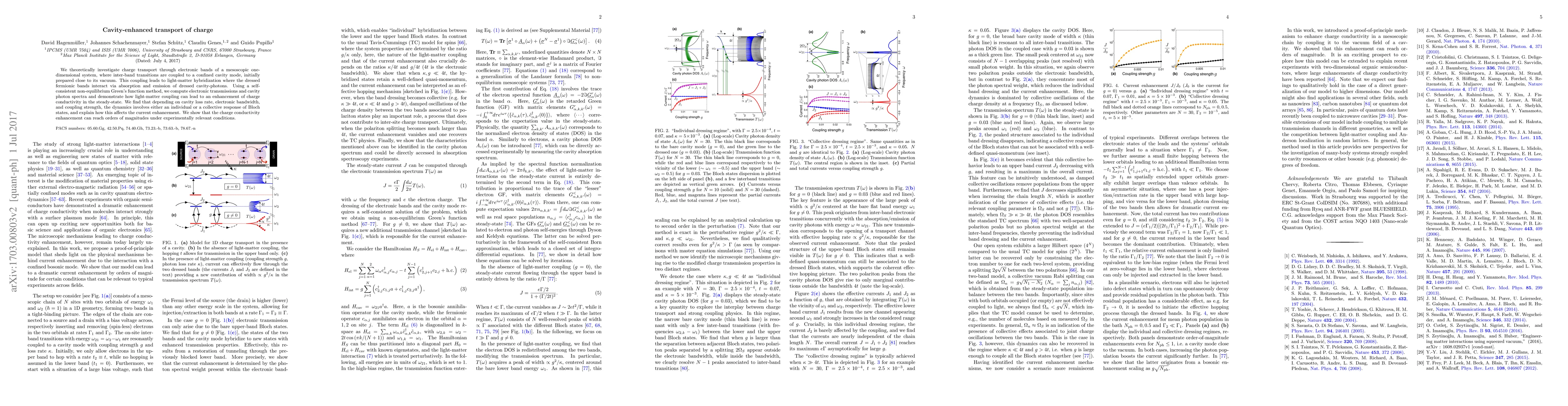 We theoretically investigate charge transport through electronic bands of a mesoscopic one-dimensional system, where inter-band transitions are coupled to a confined cavity mode, initially prepared close to its vacuum. This coupling leads to light-matter hybridization where the dressed fermionic bands interact via absorption and emission of dressed cavity-photons. Using a self-consistent non-equilibrium Green's function method, we compute electronic transmissions and cavity photon spectra and demonstrate how light-matter coupling can lead to an enhancement of charge conductivity in the steady-state. We find that depending on cavity loss rate, electronic bandwidth, and coupling strength, the dynamics involves either an individual or a collective response of Bloch states, and explain how this affects the current enhancement. We show that the charge conductivity enhancement can reach orders of magnitudes under experimentally relevant conditions.