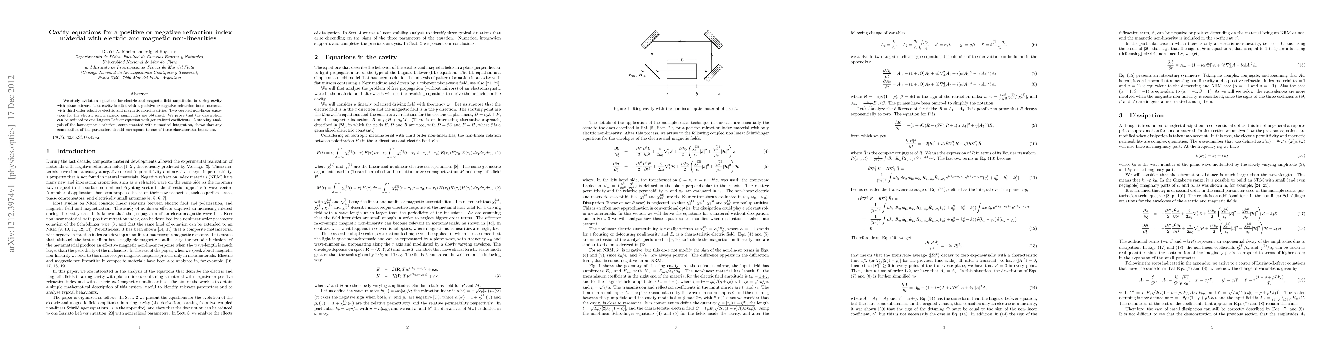 We study evolution equations for electric and magnetic field amplitudes in a ring cavity with plane mirrors. The cavity is filled with a positive or negative refraction index material with third order effective electric and magnetic non-linearities. Two coupled non-linear equations for the electric and magnetic amplitudes are obtained. We prove that the description can be reduced to one Lugiato Lefever equation with generalized coefficients. A stability analysis of the homogeneous solution, complemented with numerical integration, shows that any combination of the parameters should correspond to one of three characteristic behaviors.