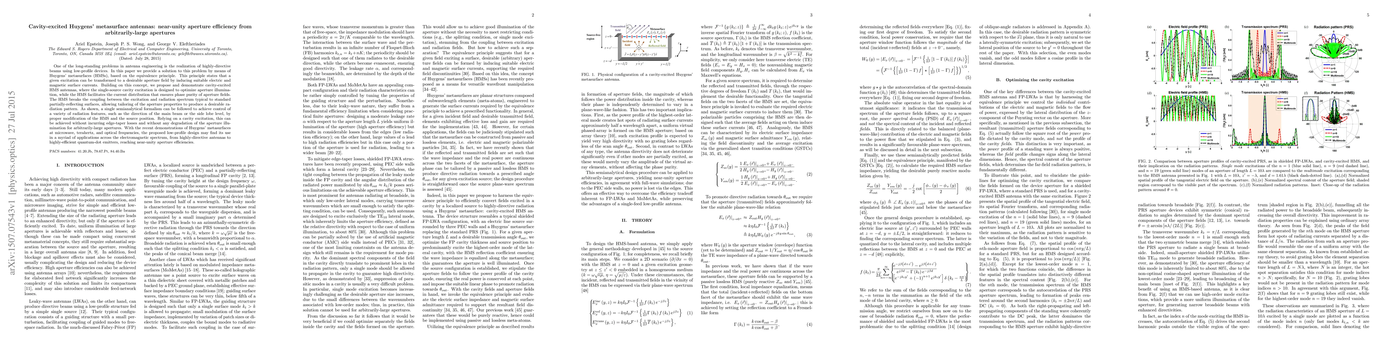 This paper proposes cavity-excited Huygens' metasurface antennas that achieve near-unity aperture efficiency and highly-directive beams using low-profile designs. The metasurfaces optimize aperture illumination and phase purity, breaking typical coupling issues to tailor radiation patterns without edge-taper losses.