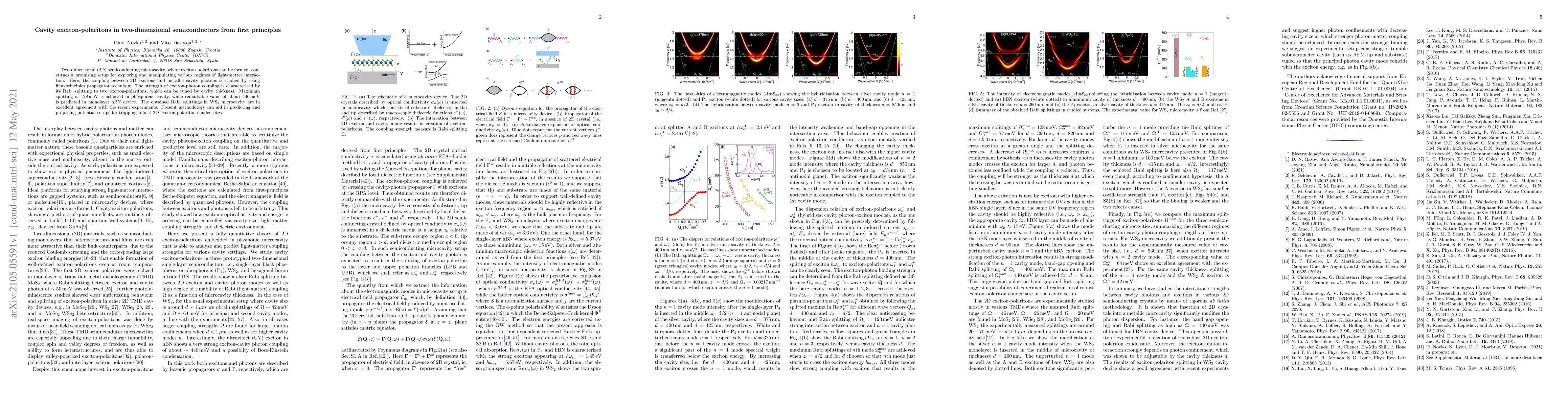 This paper investigates the coupling between excitons in 2D semiconductors and cavity photons using first-principles, finding significant Rabi splitting values that can be tuned by cavity thickness. The study predicts strong exciton-photon interactions in phosphorene and monolayer hBN devices, with potential applications in creating robust exciton-polariton condensates.