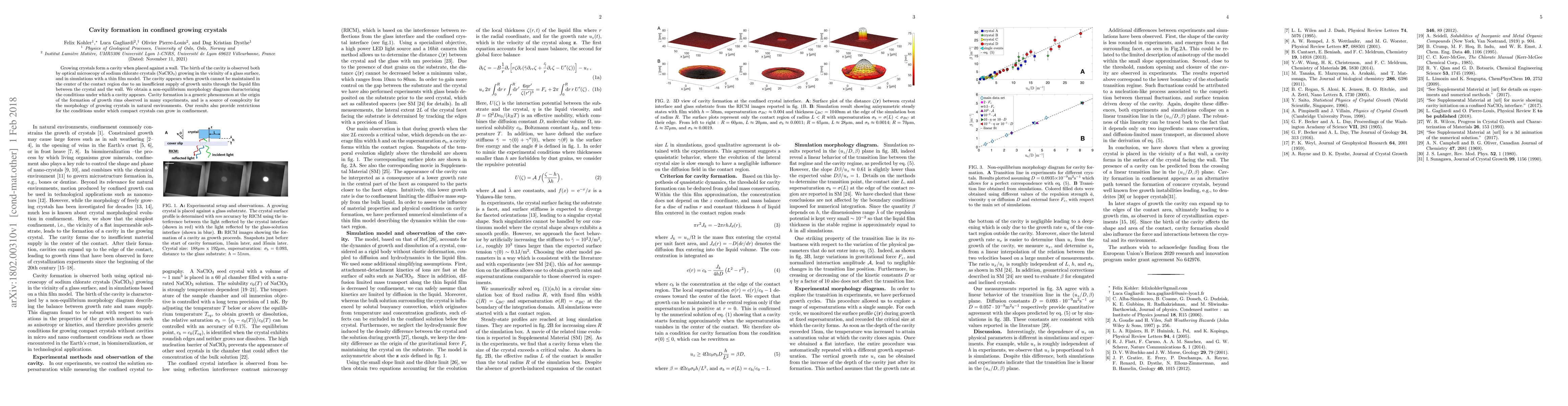 Growing crystals form a cavity when placed against a wall. The birth of the cavity is observed both by optical microscopy of sodium chlorate crystals (NaClO$_3$) growing in the vicinity of a glass surface, and in simulations with a thin film model. The cavity appears when growth cannot be maintained in the center of the contact region due to an insufficient supply of growth units through the liquid film between the crystal and the wall. We obtain a non-equilibrium morphology diagram characterizing the conditions under which a cavity appears. Cavity formation is a generic phenomenon at the origin of the formation of growth rims observed in many experiments, and is a source of complexity for the morphology of growing crystals in natural environments. Our results also provide restrictions for the conditions under which compact crystals can grow in confinement.