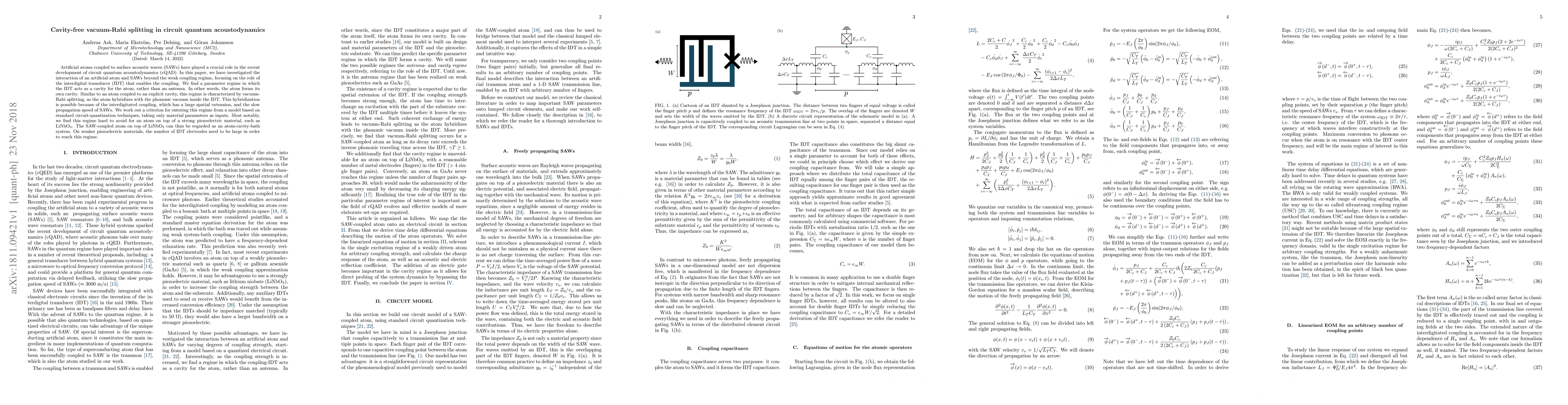 This paper investigates the interaction of artificial atoms with surface acoustic waves (SAWs) in circuit quantum acoustodynamics, finding a regime where the interdigital transducer acts as a cavity for the atom, leading to cavity-free vacuum-Rabi splitting. The study reveals that this regime is difficult to avoid on strong piezoelectric materials like LiNbO$_3$, forming an atom-cavity-bath system.