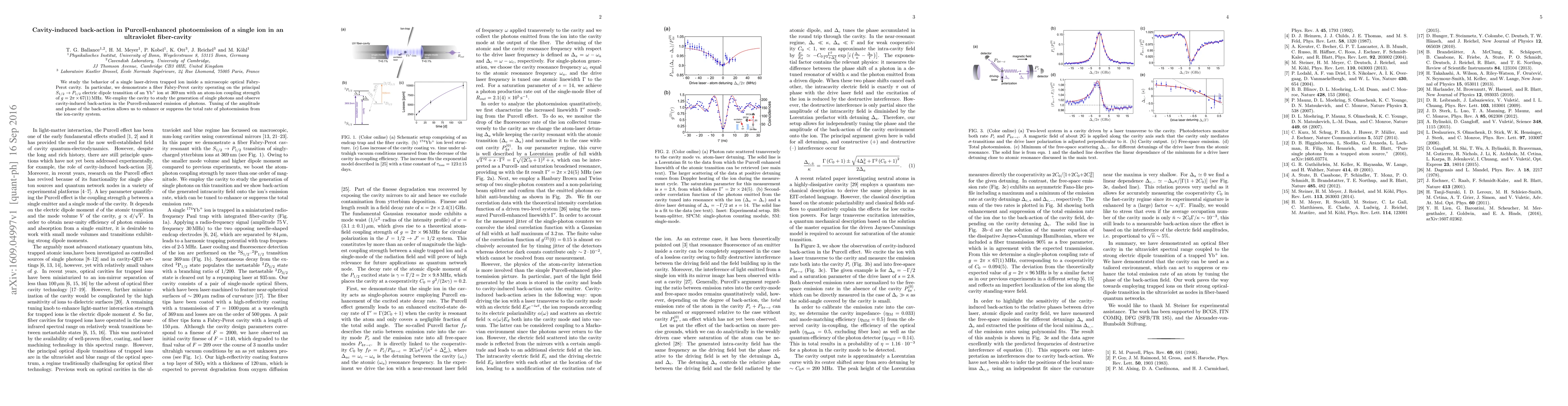 We study the behavior of a single laser-driven trapped ion inside a microscopic optical Fabry-Perot cavity. In particular, we demonstrate a fiber Fabry-Perot cavity operating on the principal $S_{1/2}\to P_{1/2}$ electric dipole transition of an Yb$^+$ ion at $369\,$nm with an atom-ion coupling strength of $g=2\pi\times 67(1)\,$MHz. We employ the cavity to study the generation of single photons and observe cavity-induced back-action in the Purcell-enhanced emission of photons. Tuning of the amplitude and phase of the back-action allows us to enhance or suppress the total rate of photoemission from the ion-cavity system.