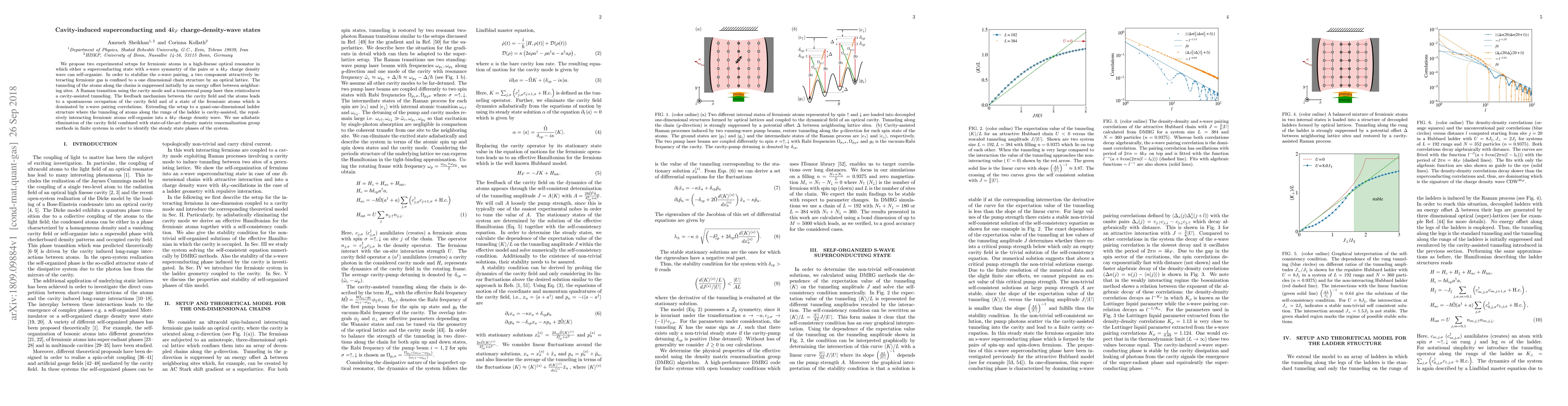 The paper proposes experimental setups for fermionic atoms in an optical resonator to stabilize s-wave superconducting pairs in a 1D chain via cavity-assisted tunneling. It also describes how repulsive fermionic atoms in a quasi-1D ladder structure can self-organize into a 4k_F charge density wave with cavity assistance. The steady-state phases are identified using adiabatic elimination of the cavity field and density matrix renormalization group methods.