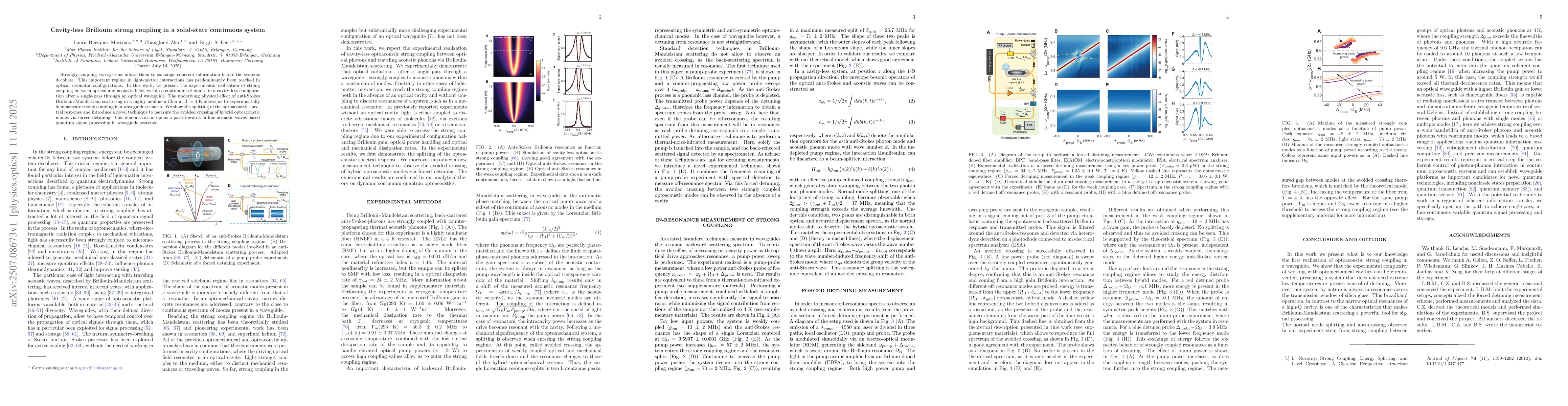 Strongly coupling two systems allows them to exchange coherent information before the systems decohere. This important regime in light-matter interactions has predominantly been reached in optical resonator configurations. In this work, we present the experimental realization of strong coupling between optical and acoustic fields within a continuum of modes in a cavity-less configuration after a single-pass through an optical waveguide. The underlying physical effect of anti-Stokes Brillouin-Mandelstam scattering in a highly nonlinear fiber at T = 4 K allows us to experimentally demonstrate strong coupling in a waveguide scenario. We show the splitting of the optoacoustic spectral response and introduce a novel technique to measure the avoided crossing of hybrid optoacoustic modes via forced detuning. This demonstration opens a path towards in-line acoustic-waves-based quantum signal processing in waveguide systems.