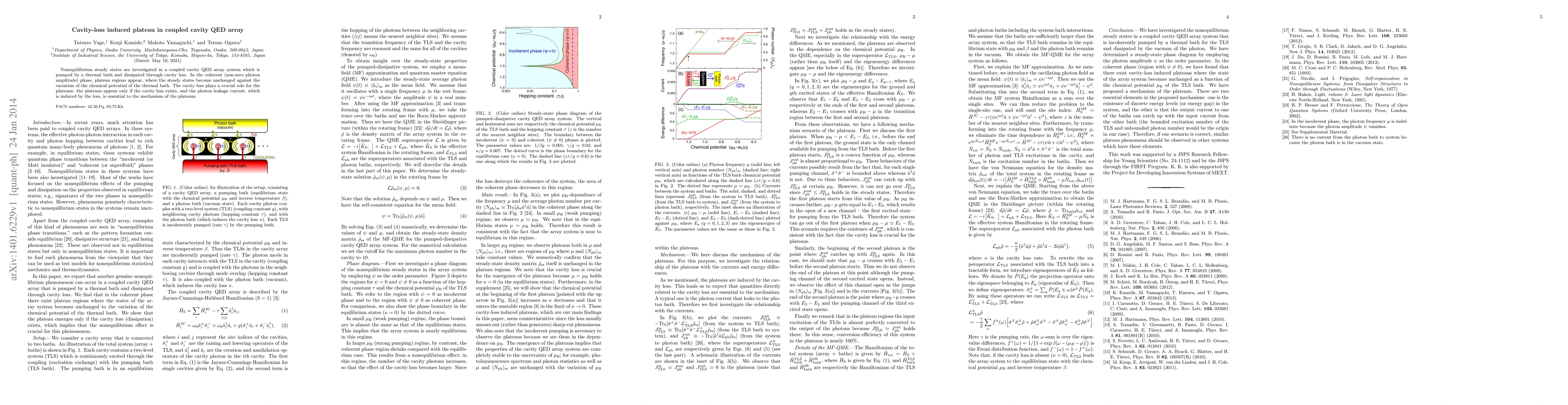 Researchers investigate plateau regions in a coupled cavity QED array system where non-equilibrium steady states appear due to thermal bath dissipation through cavity loss, requiring photon leakage current for their existence.