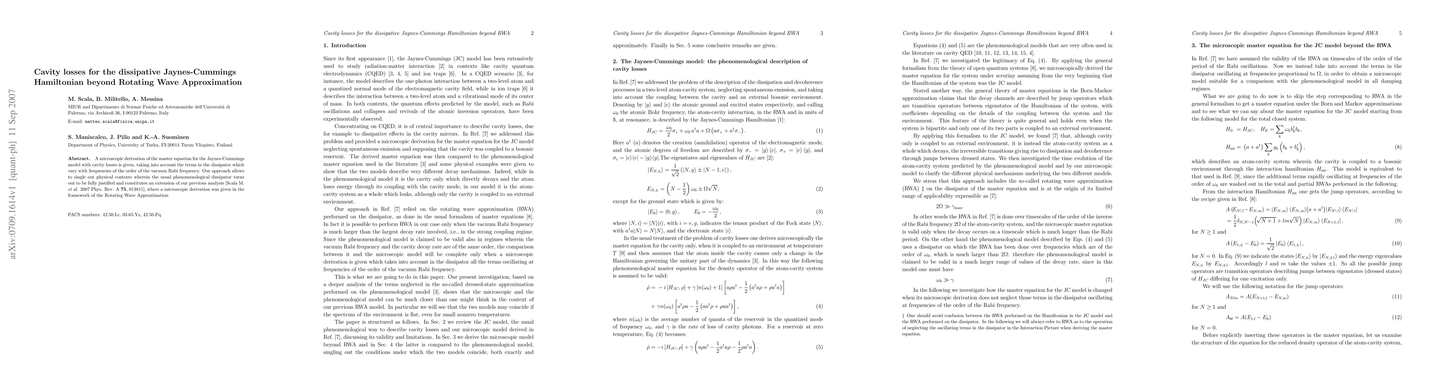 A microscopic derivation of the master equation for the Jaynes-Cummings model with cavity losses is given, taking into account the terms in the dissipator which vary with frequencies of the order of the vacuum Rabi frequency. Our approach allows to single out physical contexts wherein the usual phenomenological dissipator turns out to be fully justified and constitutes an extension of our previous analysis [Scala M. {\em et al.} 2007 Phys. Rev. A {\bf 75}, 013811], where a microscopic derivation was given in the framework of the Rotating Wave Approximation.