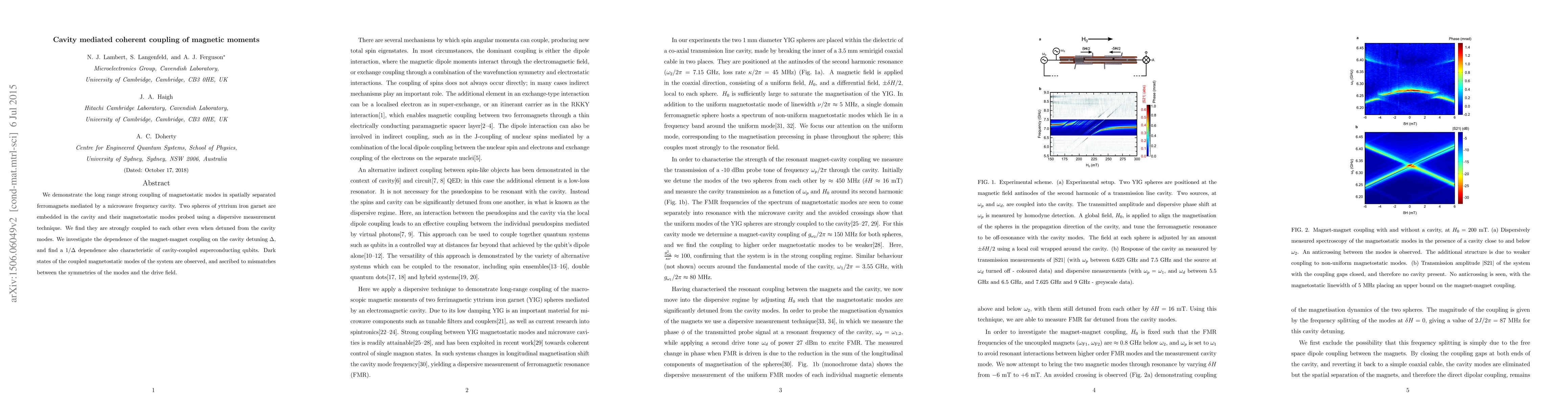 This paper demonstrates strong, long-range coupling between spatially separated ferromagnets mediated by a microwave cavity, showing a $1/\Delta$ dependence similar to cavity-coupled qubits. The study reveals dark states in the coupled magnetostatic modes due to symmetry mismatches.
