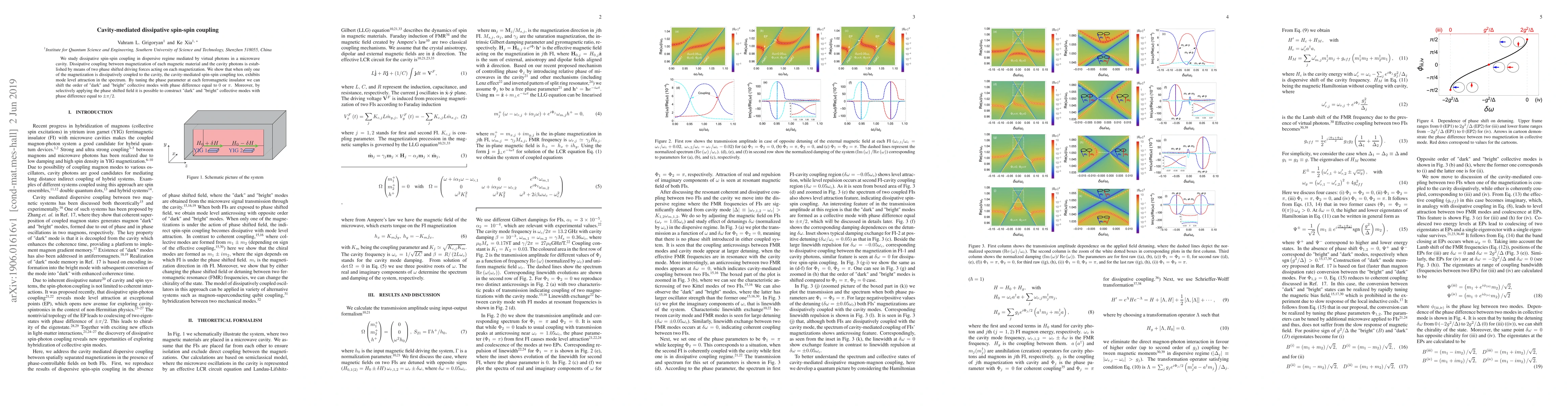 This research investigates dissipative spin-spin coupling mediated by virtual photons in a microwave cavity, revealing mode level attraction in the spectrum when one magnetization is coupled to the cavity. Tuning phase parameters allows shifting the order of "dark" and "bright" collective modes, enabling construction of modes with specific phase differences.