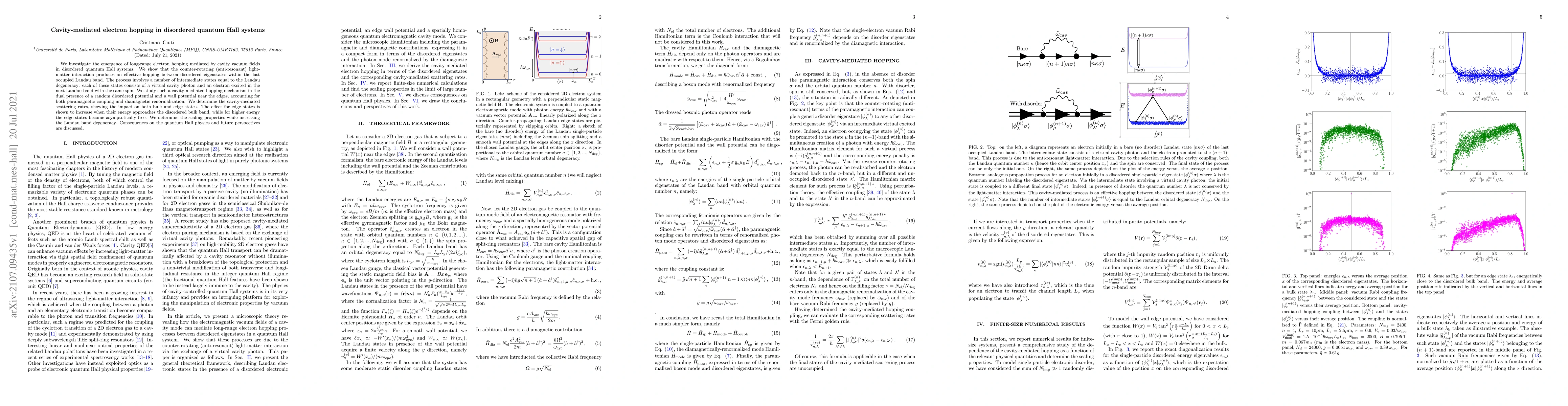 This study explores electron hopping in disordered quantum Hall systems via cavity vacuum fields, revealing long-range interactions mediated by counter-rotating light-matter coupling. The research shows the effect scales with Landau degeneracy and impacts both bulk and edge states, with enhanced effects near the disordered bulk band.