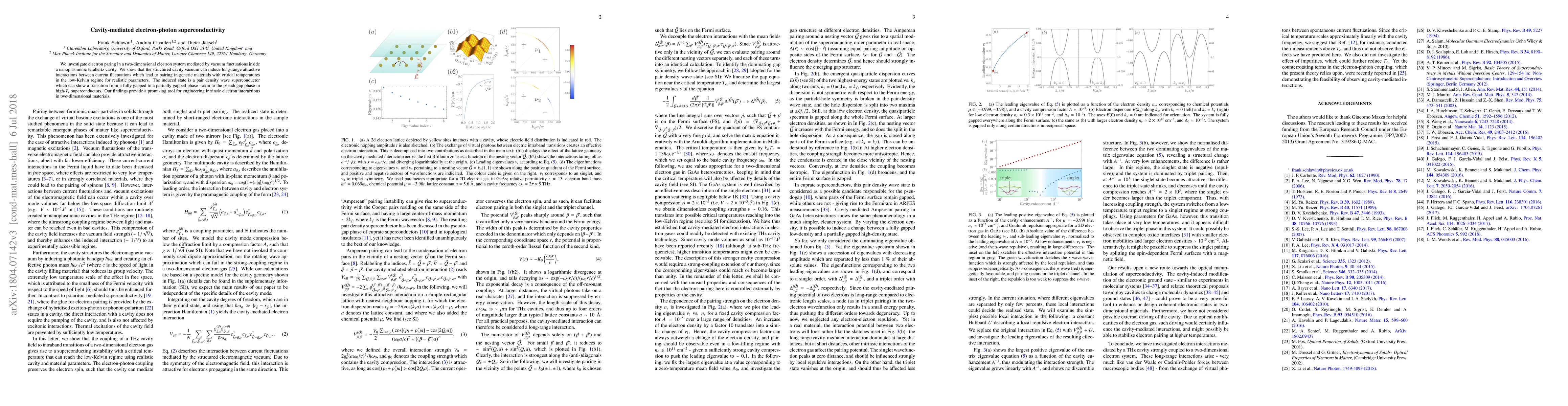 We investigate electron paring in a two-dimensional electron system mediated by vacuum fluctuations inside a nanoplasmonic terahertz cavity. We show that the structured cavity vacuum can induce long-range attractive interactions between current fluctuations which lead to pairing in generic materials with critical temperatures in the low-Kelvin regime for realistic parameters. The induced state is a pair density wave superconductor which can show a transition from a fully gapped to a partially gapped phase - akin to the pseudogap phase in high-$T_c$ superconductors. Our findings provide a promising tool for engineering intrinsic electron interactions in two-dimensional materials.