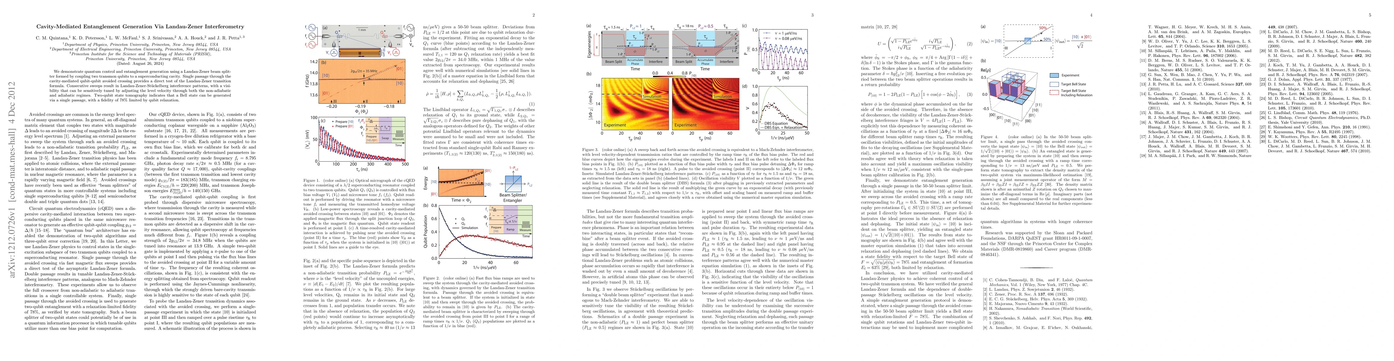 This paper demonstrates quantum control and entanglement generation using a Landau-Zener beam splitter formed by coupling two transmon qubits to a superconducting cavity, achieving a Bell state with 78% fidelity. The study explores the visibility of Landau-Zener-Stuckelberg interference patterns, which can be tuned by adjusting the qubit's velocity through non-adiabatic and adiabatic regimes.