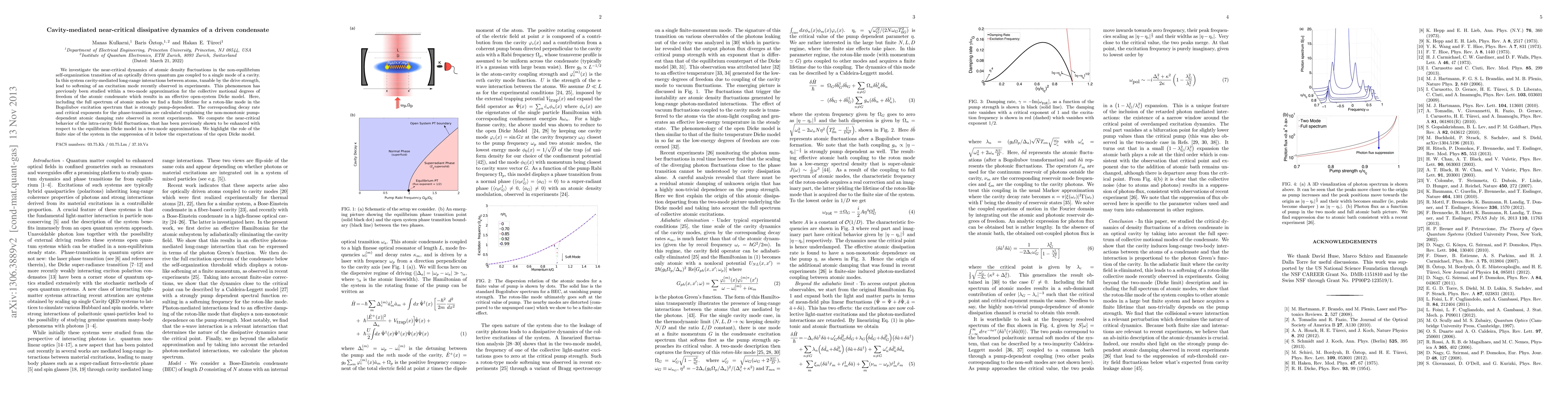 This paper examines the near-critical dynamics of atomic density fluctuations in a driven quantum gas interacting with a cavity mode, revealing a pump-dependent finite lifetime for a roton-like excitation mode. It highlights the suppression of intra-cavity field fluctuations by the system's finite size, explaining non-monotonic damping rates and phase-transition critical exponents observed in experiments.
