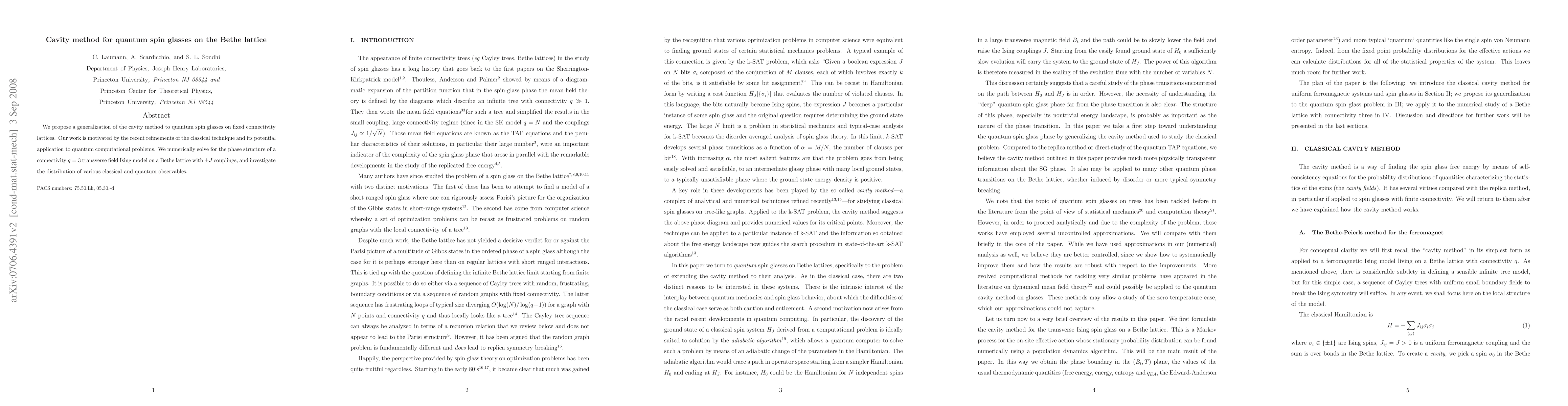 This paper proposes a generalized cavity method for quantum spin glasses on the Bethe lattice, motivated by classical techniques' refinements and quantum computational applications. The authors numerically analyze a $q=3$ transverse field Ising model on a Bethe lattice to investigate the phase structure and distributions of classical and quantum observables.