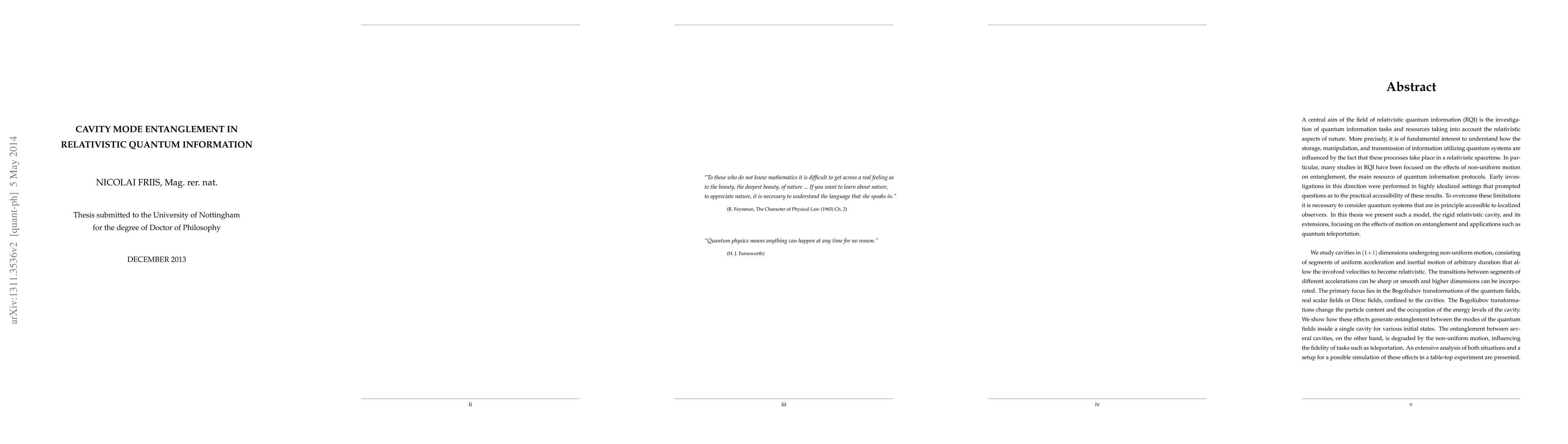 A central aim of relativistic quantum information (RQI) is the investigation of quantum information tasks and resources taking into account the relativistic aspects of nature. More precisely, it is of fundamental interest to understand how the storage, manipulation, and transmission of information utilizing quantum systems are influenced by the fact that these processes take place in a relativistic spacetime. In particular, many studies in RQI have been focused on the effects of non-uniform motion on entanglement, the main resource of quantum information protocols. Early investigations in this direction were performed in highly idealized settings that prompted questions as to the practical accessibility of these results. To overcome these limitations it is necessary to consider quantum systems that are in principle accessible to localized observers. In this thesis we present such a model, the rigid relativistic cavity, and its extensions, focusing on the effects of motion on entanglement and applications such as quantum teleportation. We study cavities in (1+1) dimensions undergoing non-uniform motion, consisting of segments of uniform acceleration and inertial motion of arbitrary duration that allow the involved velocities to become relativistic. The transitions between segments can be sharp or smooth and higher dimensions can be incorporated. The primary focus lies in the Bogoliubov transformations of the quantum fields, real scalar fields or Dirac fields, confined to the cavities. The Bogoliubov transformations change the particle content and the occupation of the energy levels of the cavity. We show how these effects generate entanglement between the modes of the quantum fields inside a single cavity for various initial states. The entanglement between several cavities, on the other hand, is degraded by the non-uniform motion, influencing the fidelity of tasks such as teleportation.