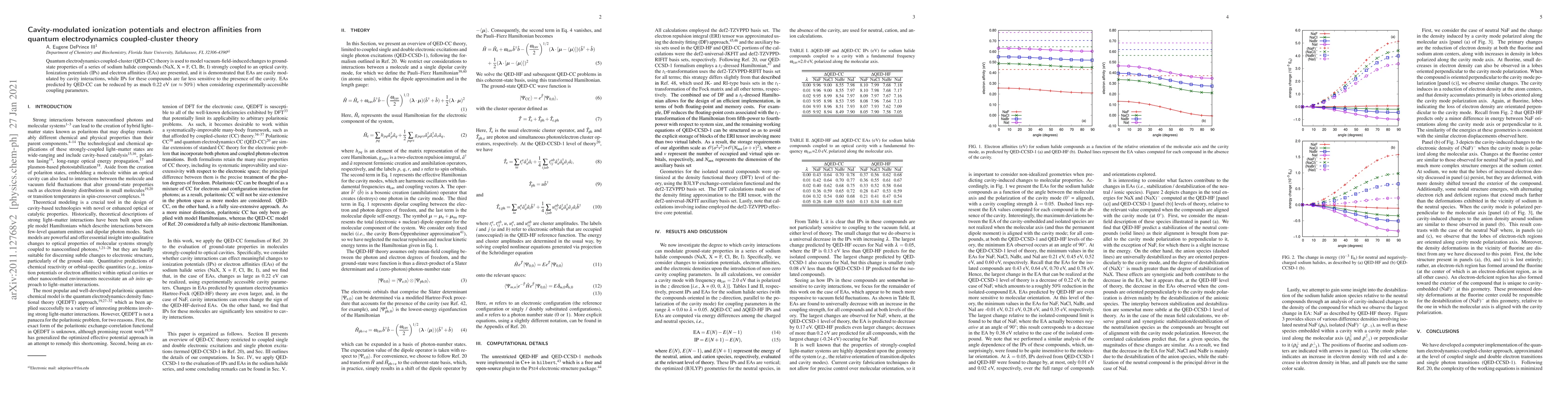This paper utilizes quantum electrodynamics coupled-cluster (QED-CC) theory to investigate how optical cavity interactions affect ionization potentials (IPs) and electron affinities (EAs) in sodium halide compounds. It finds that EAs are significantly modulated by cavity effects, while IPs remain largely unaffected, with EAs potentially reduced by up to 0.22 eV under strong coupling conditions.