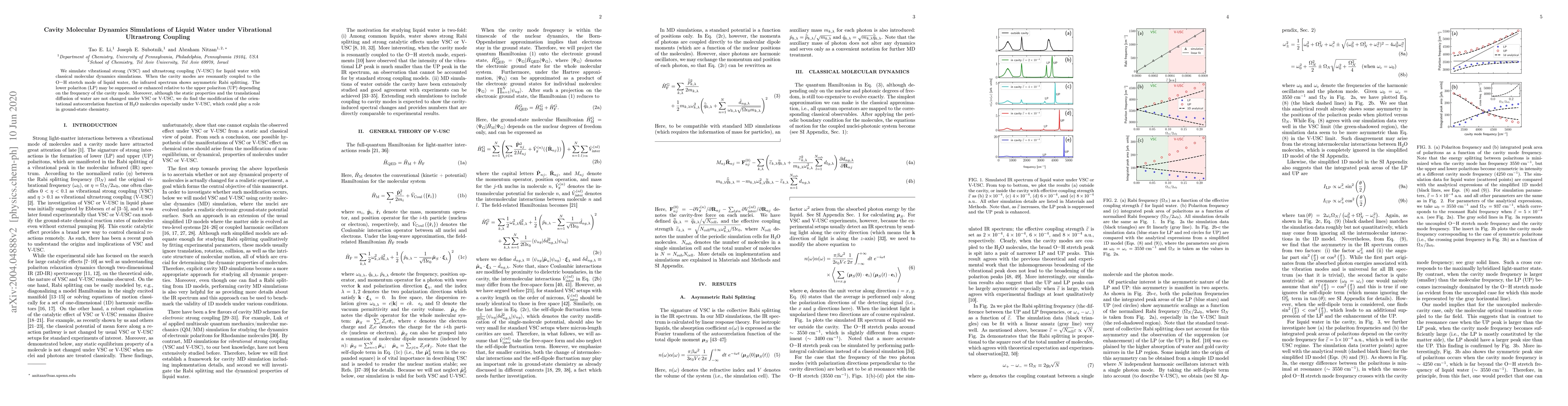 This study uses classical molecular dynamics simulations to investigate liquid water under vibrational strong and ultrastrong coupling, revealing asymmetric Rabi splitting in the infrared spectrum and modifications in the orientational dynamics of water molecules, particularly under ultrastrong coupling, which may influence ground-state chemistry.
