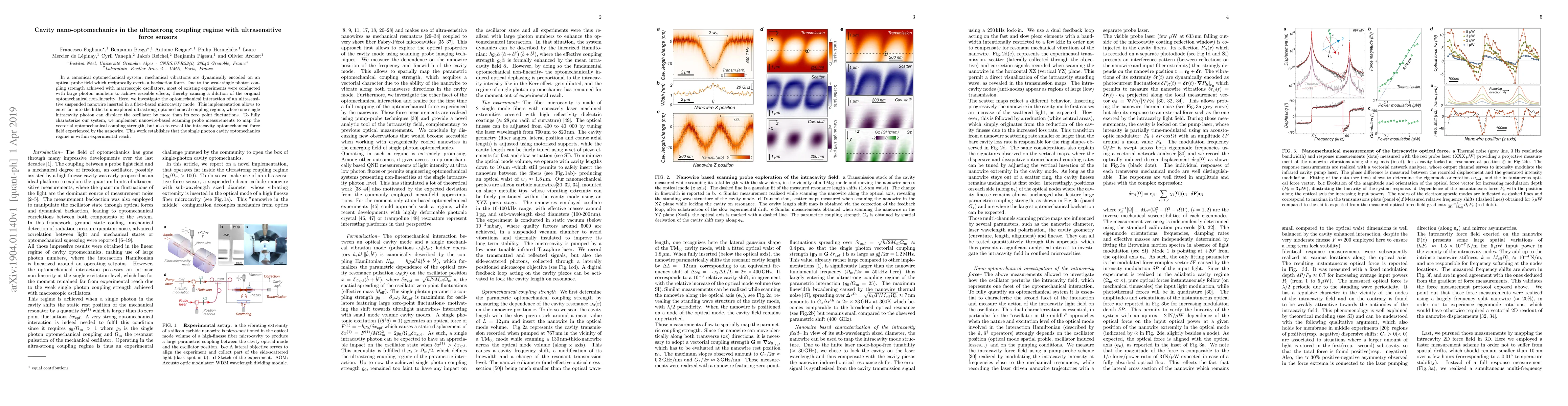 This paper explores the ultrastrong coupling regime in cavity nano-optomechanics using an ultrasensitive suspended nanowire in a fiber-based microcavity, enabling single photon interactions to significantly displace the oscillator. The study employs nanowire-based scanning probe measurements to characterize the optomechanical coupling and force field.