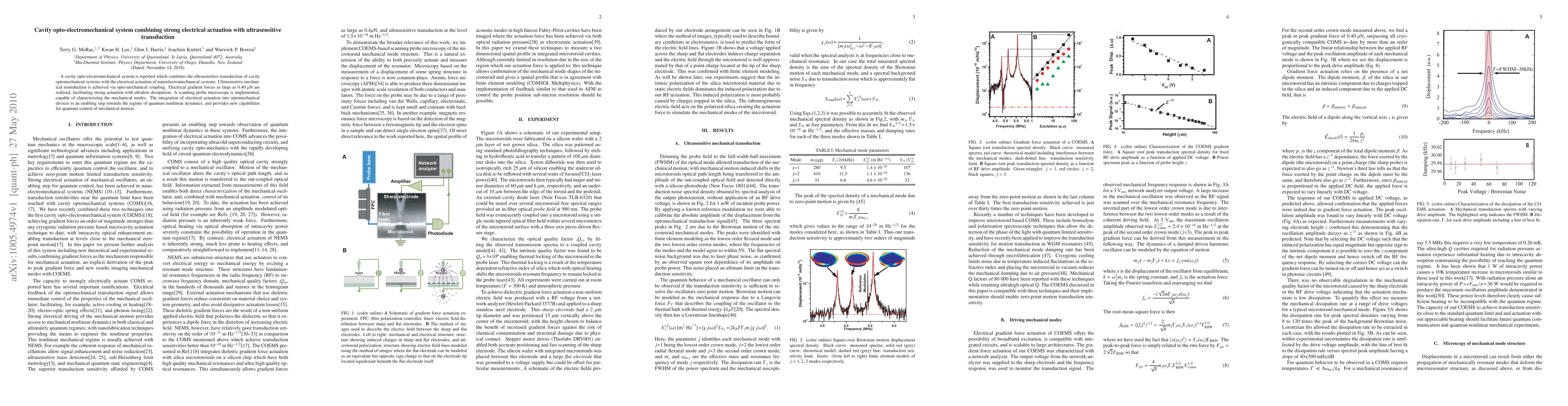 The paper describes a cavity opto-electromechanical system that combines electrical actuation with ultrasensitive mechanical transduction via opto-mechanical coupling, enabling strong actuation with minimal dissipation and paving the way for quantum nonlinear dynamics and control. A scanning probe microscope is used to characterize the mechanical modes, highlighting new capabilities for quantum control.