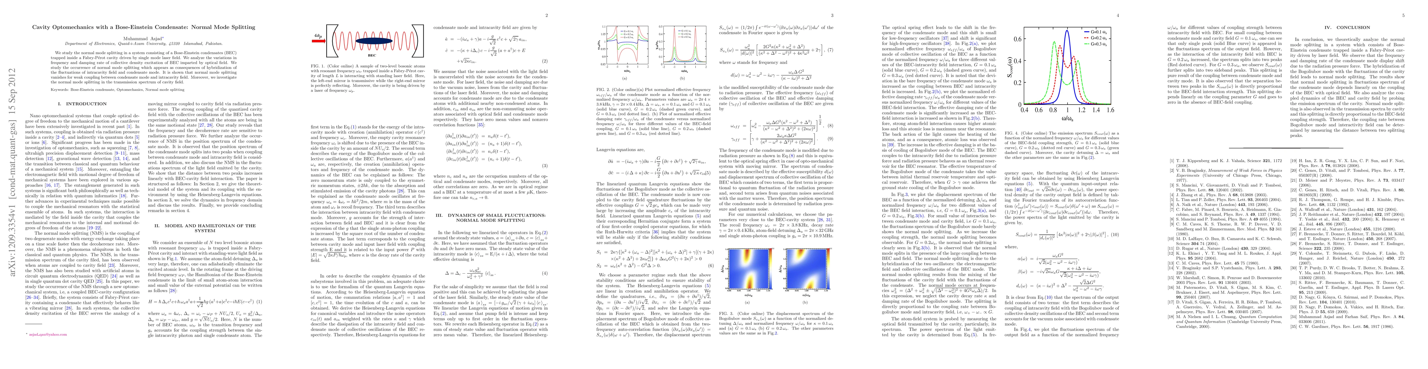 The paper presents a comprehensive theoretical analysis of normal mode splitting in a cavity optomechanical system involving a BEC, including linearized quantum Langevin equations and stability conditions.