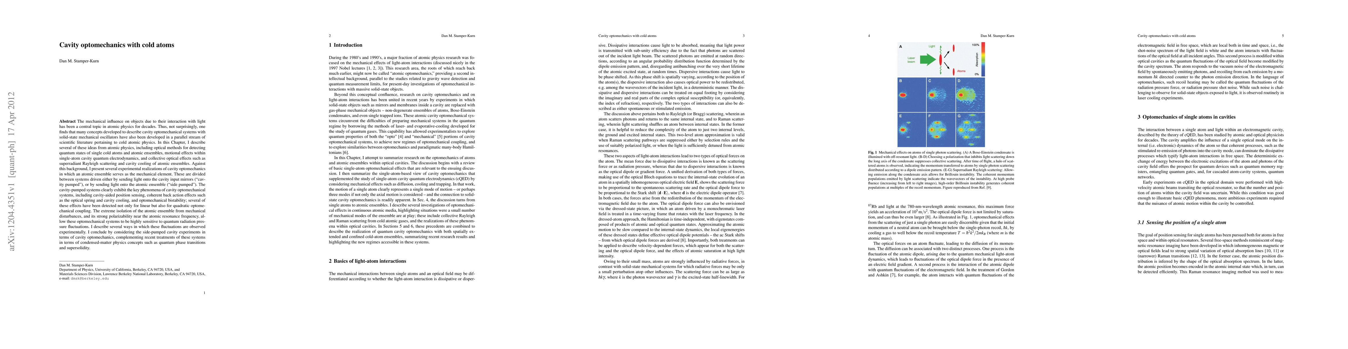 This paper explores cavity optomechanics using cold atoms as mechanical elements, detailing experimental setups and phenomena such as cavity-aided sensing, coherent back action, and quantum radiation pressure fluctuations. It discusses both cavity-pumped and side-pumped systems, highlighting their optomechanical and collective optical effects.