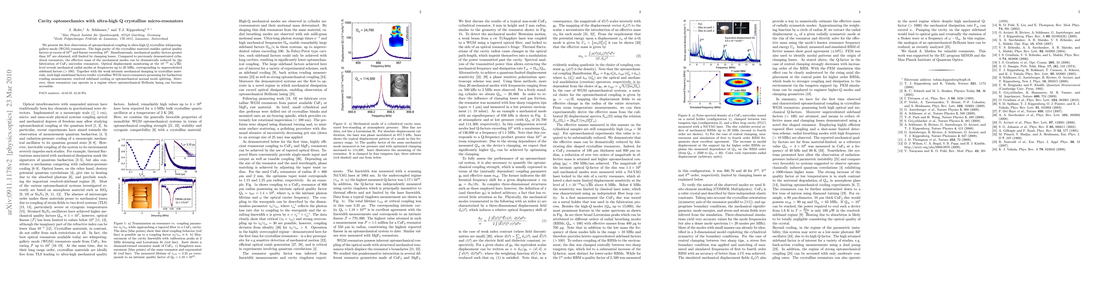 This research reports the first optomechanical coupling in ultra-high Q crystalline whispering-gallery-mode resonators, achieving unprecedented optical and mechanical quality factors. These CaF2 microdisc resonators enable optomechanical normal mode splitting and backaction evading measurements due to their high sideband factors and low mechanical damping.