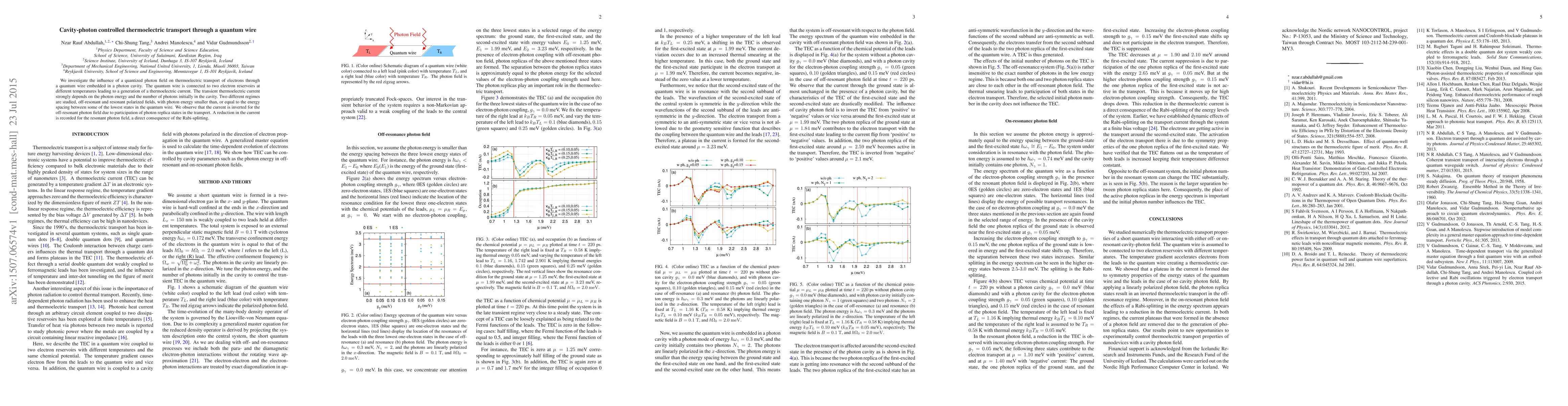 This paper explores how a quantized photon field in a cavity affects thermoelectric transport in a quantum wire, revealing current inversion under off-resonant conditions due to photon replica states and current reduction under resonant conditions due to Rabi-splitting.