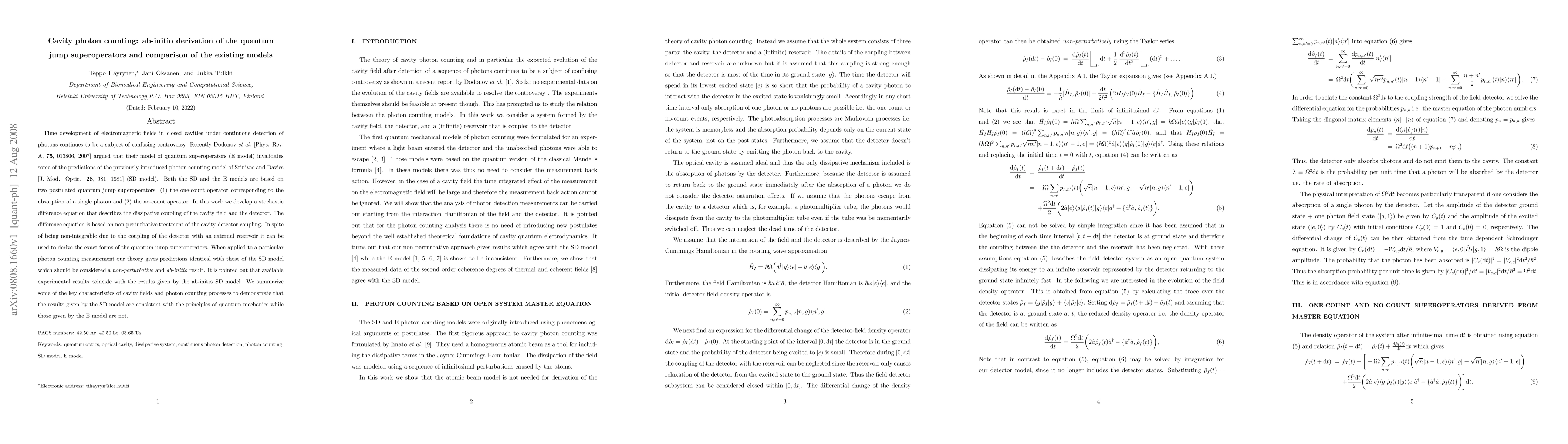 Time development of electromagnetic fields in closed cavities under continuous detection of photons continues to be a subject of confusing controversy. Recently Dodonov et al. [Phys. Rev. A, 75, 013806, 2007] argued that their model of quantum superoperators (E model) invalidates some of the predictions of the previously introduced photon counting model of Srinivas and Davies [J. Mod. Optic. 28, 981, 1981] (SD model). Both the SD and the E models are based on two postulated quantum jump superoperators: (1) the one-count operator corresponding to the absorption of a single photon and (2) the no-count operator. In this work we develop a stochastic difference equation that describes the dissipative coupling of the cavity field and the detector. The difference equation is based on non-perturbative treatment of the cavity-detector coupling. In spite of being non-integrable due to the coupling of the detector with an external reservoir it can be used to derive the exact forms of the quantum jump superoperators. When applied to a particular photon counting measurement our theory gives predictions identical with those of the SD model which should be considered a non-perturbative and ab-initio result. It is pointed out that available experimental results coincide with the results given by the ab-initio SD model. We summarize some of the key characteristics of cavity fields and photon counting processes to demonstrate that the results given by the SD model are consistent with the principles of quantum mechanics while those given by the E model are not.