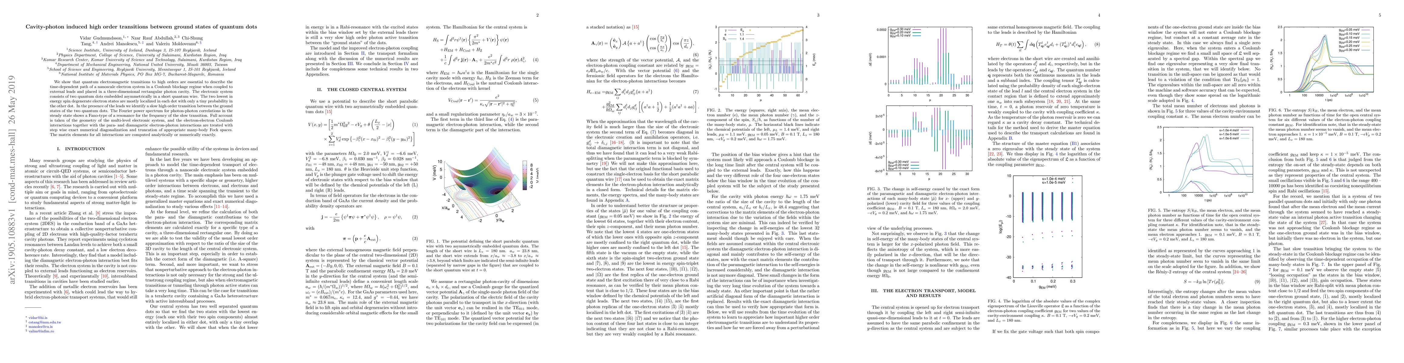 We show that quantum electromagnetic transitions to high orders are essential to describe the time-dependent path of a nanoscale electron system in a Coulomb blockage regime when coupled to external leads and placed in a three-dimensional rectangular photon cavity. The electronic system consists of two quantum dots embedded asymmetrically in a short quantum wire. The two lowest in energy spin degenerate electron states are mostly localized in each dot with only a tiny probability in the other dot. In the presence of the leads we identify a slow high order transition between the ground states of the two quantum dots. The Fourier power spectrum for photon-photon correlations in the steady state shows a Fano-type of a resonance for the frequency of the slow transition. Full account is taken of the geometry of the multi-level electronic system, and the electron-electron Coulomb interactions together with the para- and diamagnetic electron-photon interactions are treated with step wise exact numerical diagonalization and truncation of appropriate many-body Fock spaces. The matrix elements for all interactions are computed analytically or numerically exactly.