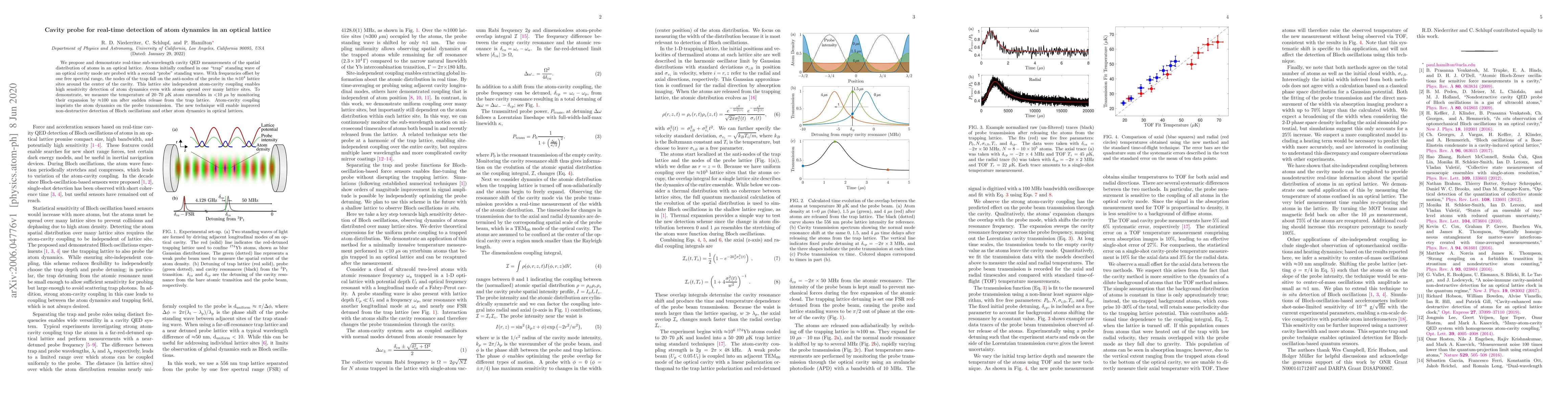This paper proposes a cavity probe technique for real-time, high-sensitivity detection of atom dynamics in optical lattices, demonstrating the method by measuring the temperature of atom ensembles with sub-microsecond resolution. The technique leverages atom-cavity coupling across multiple lattice sites to monitor atomic expansion after release.