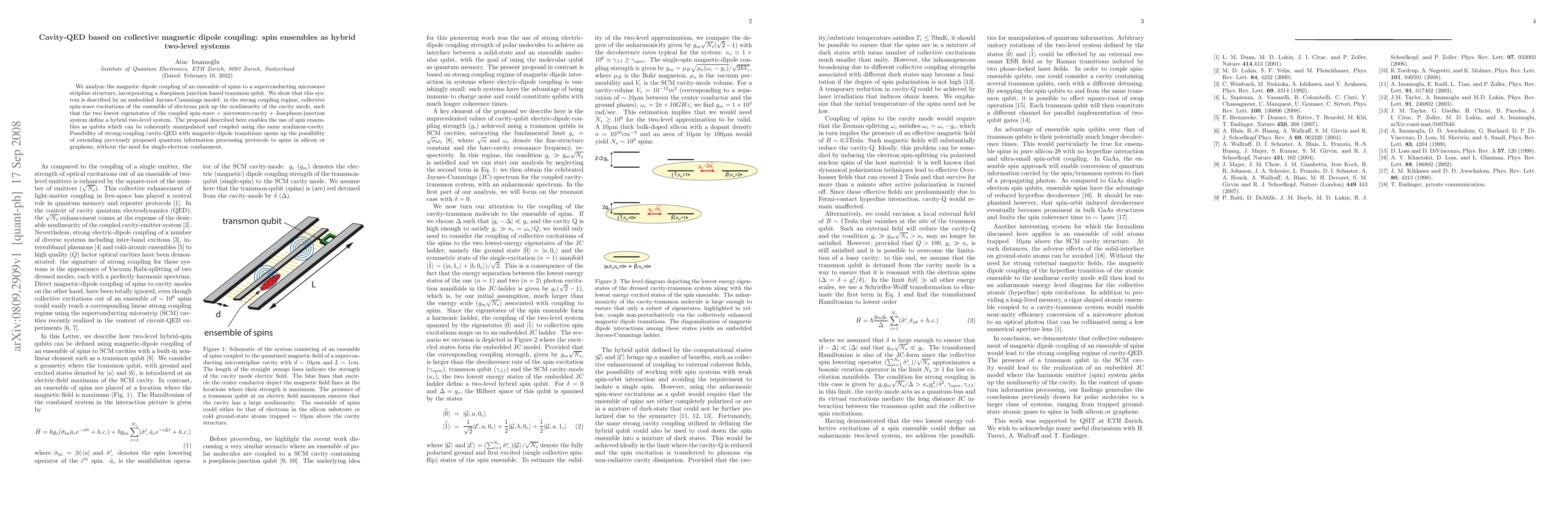 This paper explores the magnetic dipole coupling of spin ensembles to a superconducting microwave stripline, demonstrating a hybrid two-level system described by an embedded Jaynes-Cummings model. The study proposes using spin ensembles as qubits that can be manipulated and coupled via a nonlinear cavity, enabling strong-coupling cavity-QED with magnetic-dipole transitions for quantum information processing in silicon or graphene.