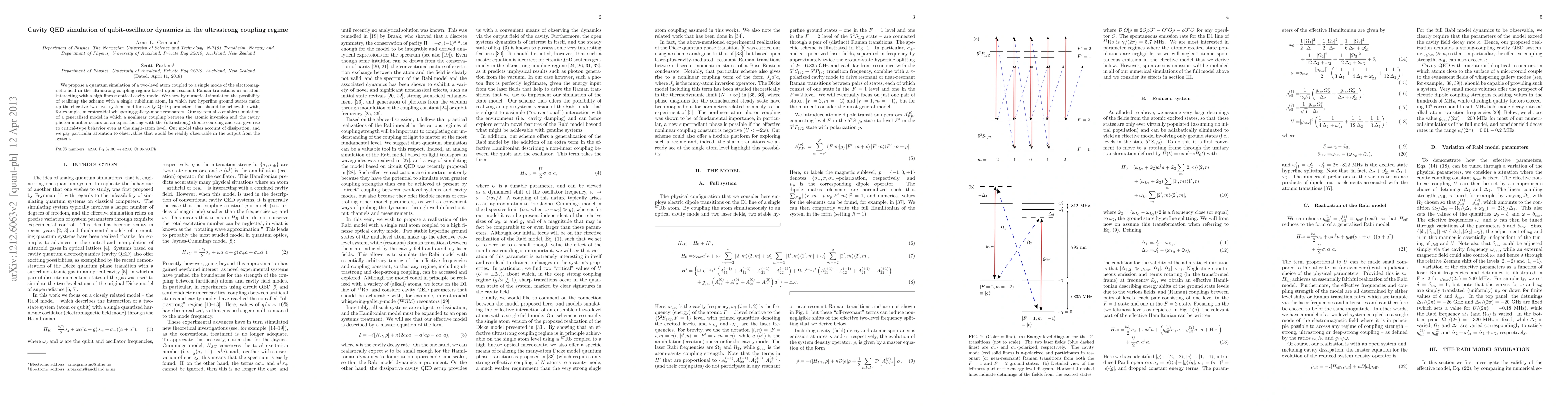 This paper proposes a quantum simulation of qubit-oscillator dynamics in the ultrastrong coupling regime using resonant Raman transitions in a rubidium atom within a high finesse optical cavity. The model also enables simulation of nonlinear interactions and critical behavior, with a focus on realistic observables and achievable parameters.
