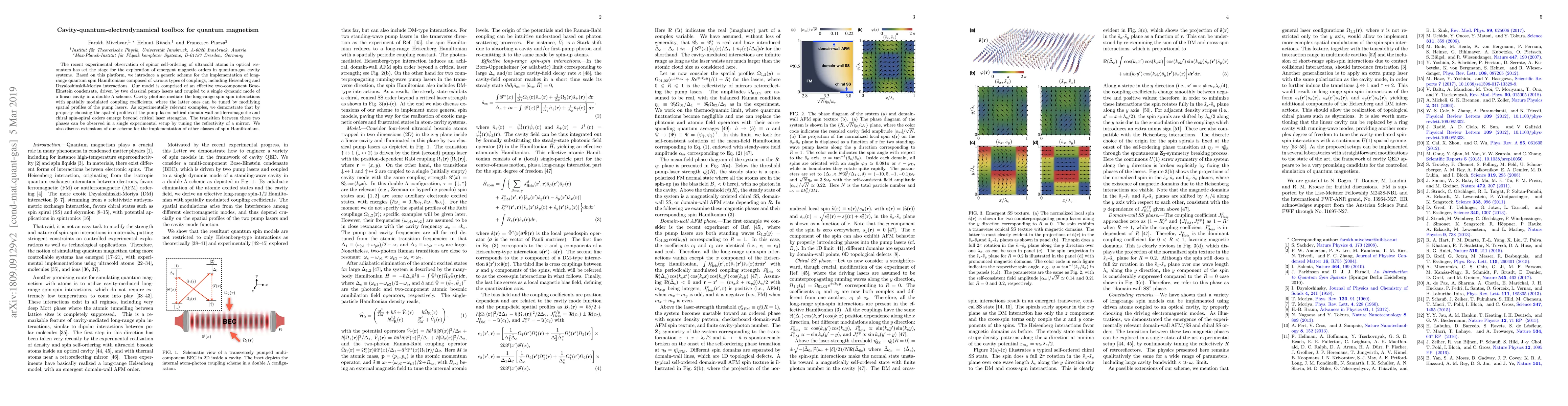The recent experimental observation of spinor self-ordering of ultracold atoms in optical resonators has set the stage for the exploration of emergent magnetic orders in quantum-gas--cavity systems. Based on this platform, we introduce a generic scheme for the implementation of long-range quantum spin Hamiltonians composed of various types of couplings, including Heisenberg and Dzyaloshinskii-Moriya interactions. Our model is comprised of an effective two-component Bose-Einstein condensate, driven by two classical pump lasers and coupled to a single dynamic mode of a linear cavity in a double $\Lambda$ scheme. Cavity photons mediate the long-range spin-spin interactions with spatially modulated coupling coefficients, where the latter ones can be tuned by modifying spatial profiles of the pump lasers. As experimentally relevant examples, we demonstrate that by properly choosing the spatial profiles of the pump lasers achiral domain-wall antiferromagnetic and chiral spin-spiral orders emerge beyond critical laser strengths. The transition between these two phases can be observed in a single experimental setup by tuning the reflectivity of a mirror. We also discuss extensions of our scheme for the implementation of other classes of spin Hamiltonians.