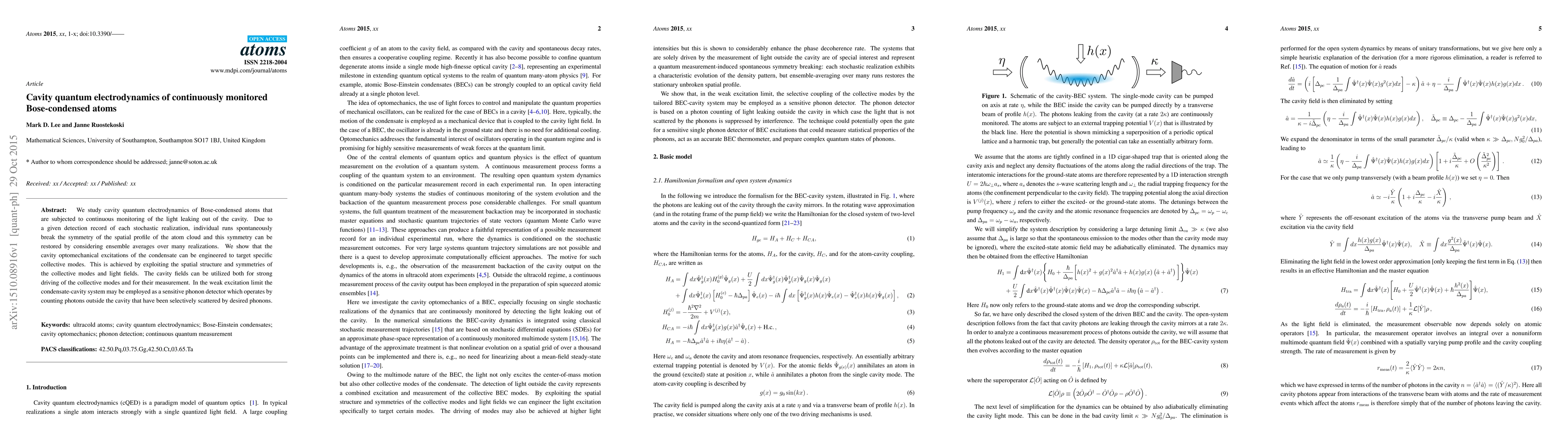 This paper investigates the cavity quantum electrodynamics of Bose-condensed atoms under continuous monitoring, demonstrating how individual runs break symmetry but can be restored through ensemble averages. The study shows how cavity optomechanical excitations can target specific collective modes by leveraging spatial structures and symmetries.