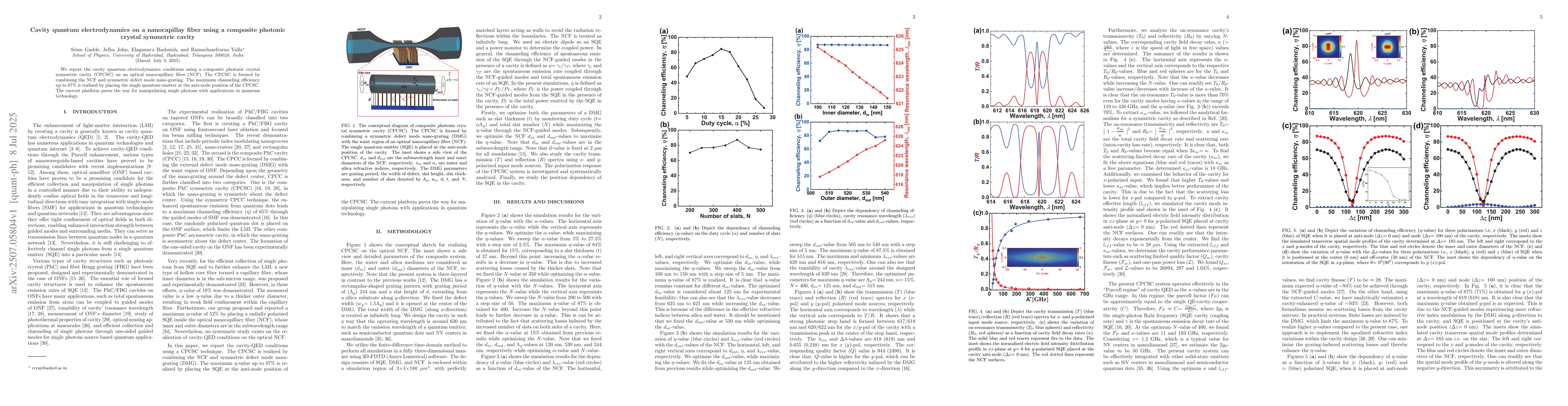 We report the cavity quantum electrodynamics conditions using a composite photonic crystal symmetric cavity (CPCSC) on an optical nanocapillary fiber (NCF). The CPCSC is formed by combining the NCF and the symmetric defect mode nano-grating. The maximum channeling efficiency up to 87% is realized by placing the single quantum emitter at the anti-node position of the CPCSC. The current platform paves the way for manipulating single photons with applications in quantum technology.