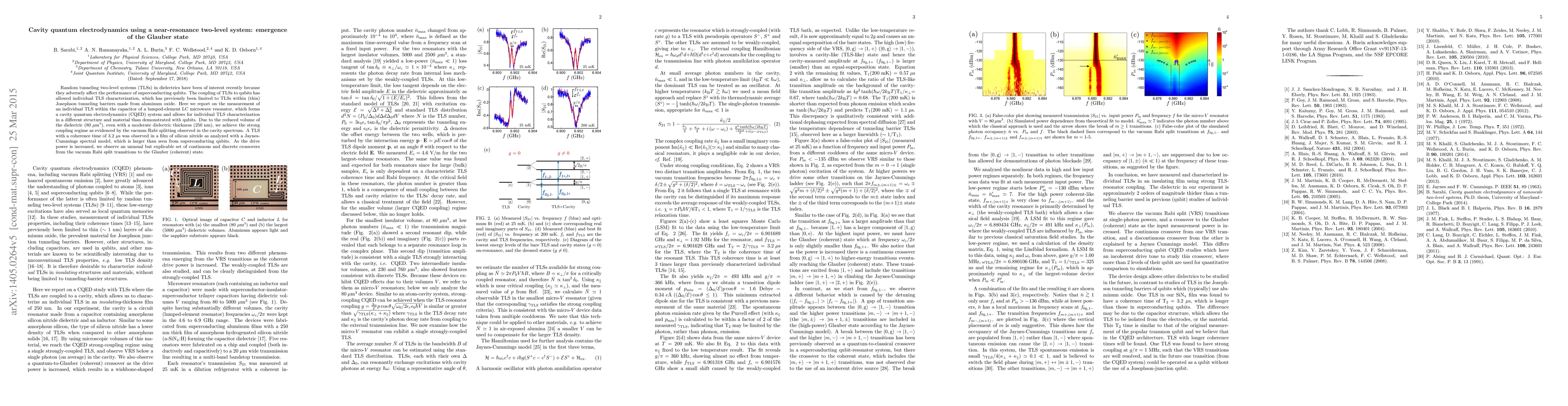 Random tunneling two-level systems (TLSs) in dielectrics have been of interest recently because they adversely affect the performance of superconducting qubits. The coupling of TLSs to qubits has allowed individual TLS characterization, which has previously been limited to TLSs within (thin) Josephson tunneling barriers made from aluminum oxide. Here we report on the measurement of an individual TLS within the capacitor of a lumped-element LC microwave resonator, which forms a cavity quantum electrodynamics (CQED) system and allows for individual TLS characterization in a different structure and material than demonstrated with qubits. Due to the reduced volume of the dielectric (80 $\mu$m$^{3}$), even with a moderate dielectric thickness (250 nm), we achieve the strong coupling regime as evidenced by the vacuum Rabi splitting observed in the cavity spectrum. A TLS with a coherence time of 3.2 $\mu$s was observed in a film of silicon nitride as analyzed with a Jaynes-Cummings spectral model, which is larger than seen from superconducting qubits. As the drive power is increased, we observe an unusual but explicable set of continuous and discrete crossovers from the vacuum Rabi split transitions to the Glauber (coherent) state.