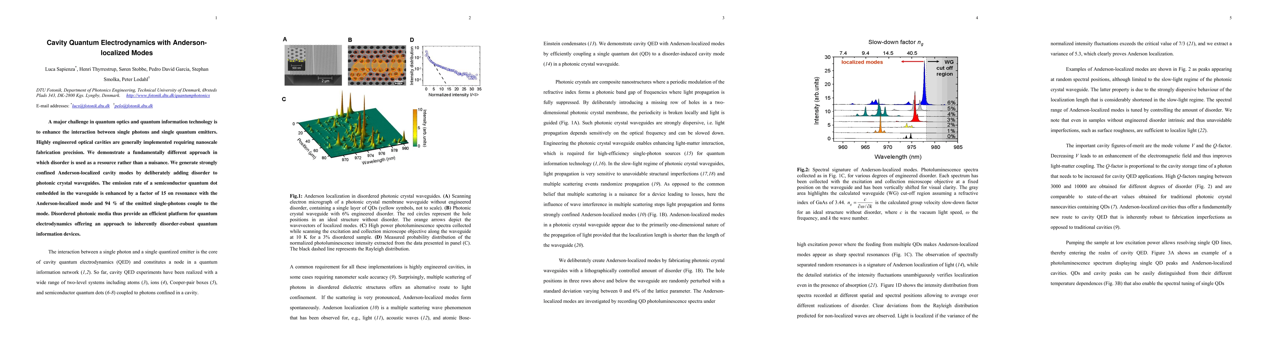 This paper demonstrates a novel approach to cavity quantum electrodynamics using disorder-induced Anderson-localized modes in photonic crystal waveguides. The interaction between single photons and quantum emitters is significantly enhanced, showing a 15-fold increase in emission rate, which suggests a robust platform for quantum information technology.