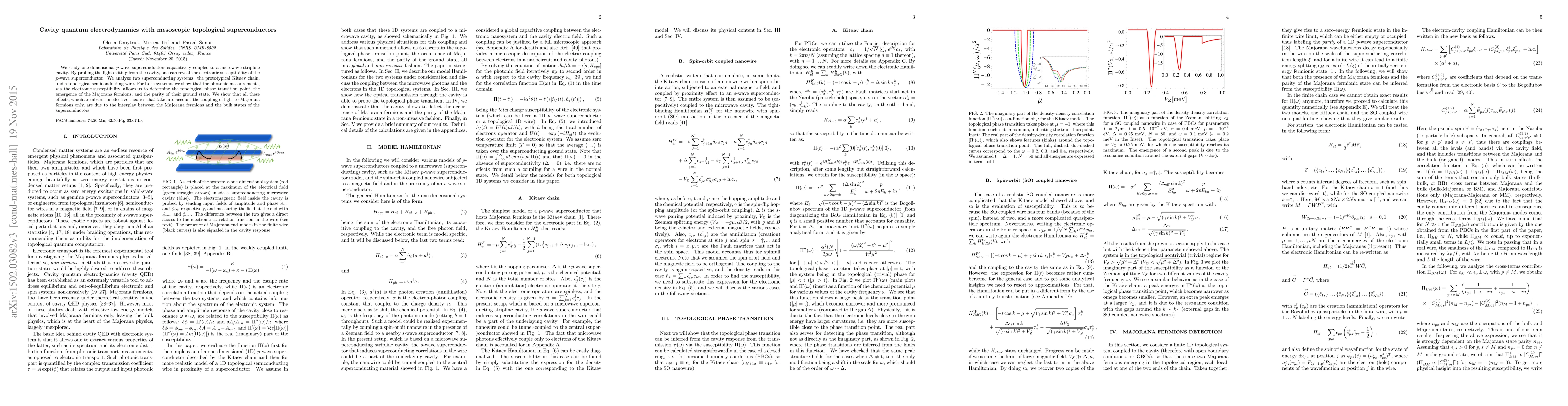 We study one-dimensional $p$-wave superconductors capacitively coupled to a microwave stripline cavity. By probing the light exiting from the cavity, one can reveal the electronic susceptibility of the $p$-wave superconductor. We analyze two superconducting systems: the prototypical Kitaev chain, and a topological semiconducting wire. For both systems, we show that the photonic measurements, via the electronic susceptibility, allows us to determine the topological phase transition point, the emergence of the Majorana fermions, and the parity of their ground state. We show that all these effects, which are absent in effective theories that take into account the coupling of light to Majorana fermions only, are due to the interplay between the Majorana fermions and the bulk states of the superconductors.