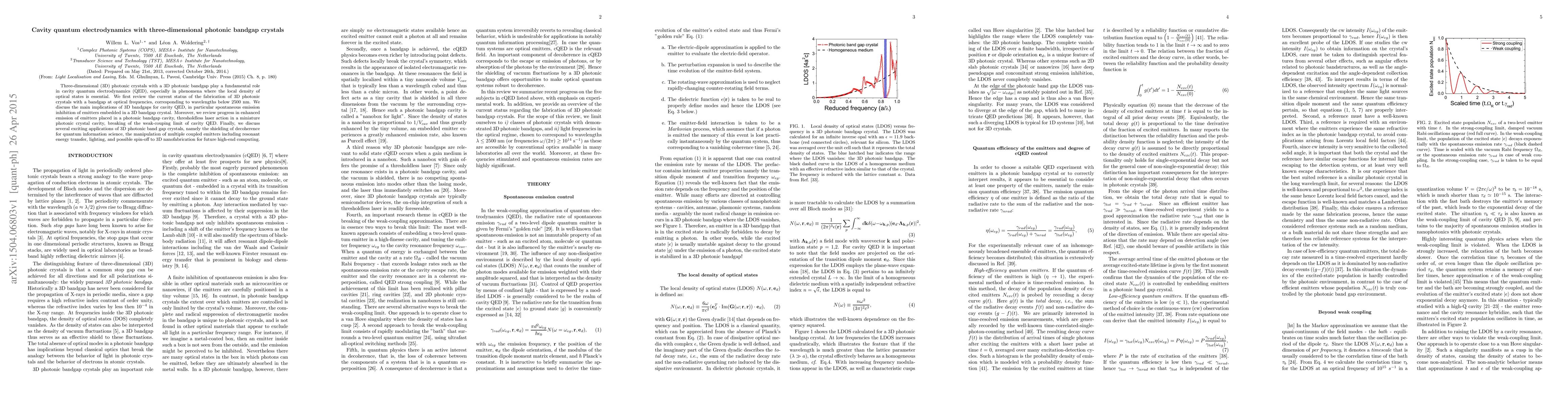 This paper reviews recent advancements in three-dimensional photonic crystals with a complete photonic bandgap, focusing on spontaneous emission inhibition, light localization, gain-based lasers, breaking of weak-coupling approximations in cavity QED, and decoherence shielding. It also evaluates known photonic crystal structures with demonstrated 3D band gaps.