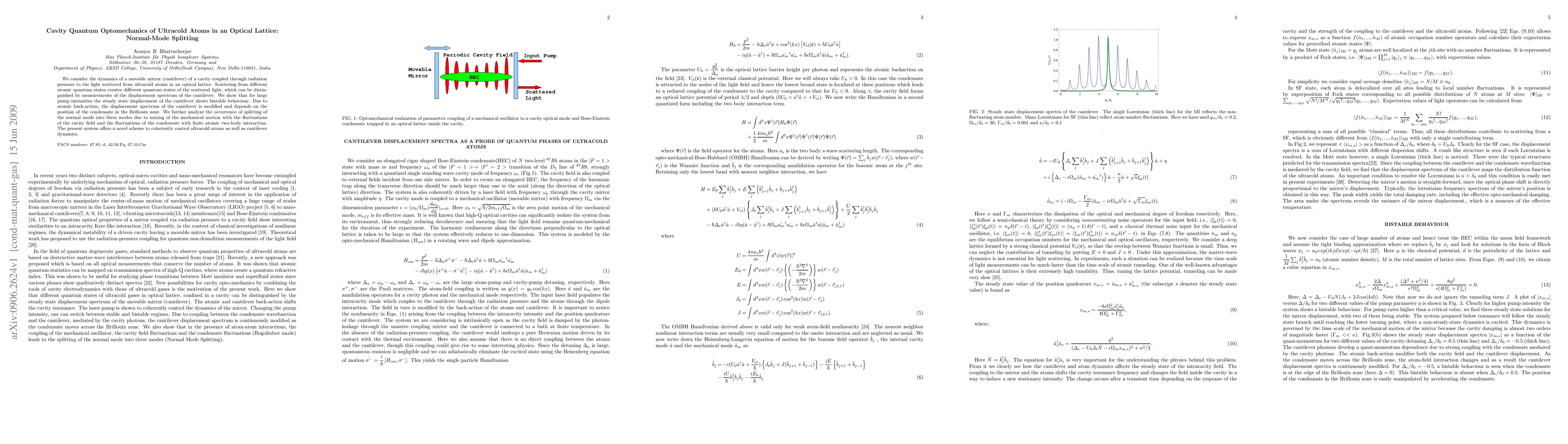 We consider the dynamics of a movable mirror (cantilever) of a cavity coupled through radiation pressure to the light scattered from ultracold atoms in an optical lattice. Scattering from different atomic quantum states creates different quantum states of the scattered light, which can be distinguished by measurements of the displacement spectrum of the cantilever. We show that for large pump intensities the steady state displacement of the cantilever shows bistable behaviour. Due to atomic back-action, the displacement spectrum of the cantilever is modified and depends on the position of the condensate in the Brillouin zone. We further analyze the occurrence of splitting of the normal mode into three modes due to mixing of the mechanical motion with the fluctuations of the cavity field and the fluctuations of the condensate with finite atomic two-body interaction. The present system offers a novel scheme to coherently control ultracold atoms as well as cantilever dynamics.