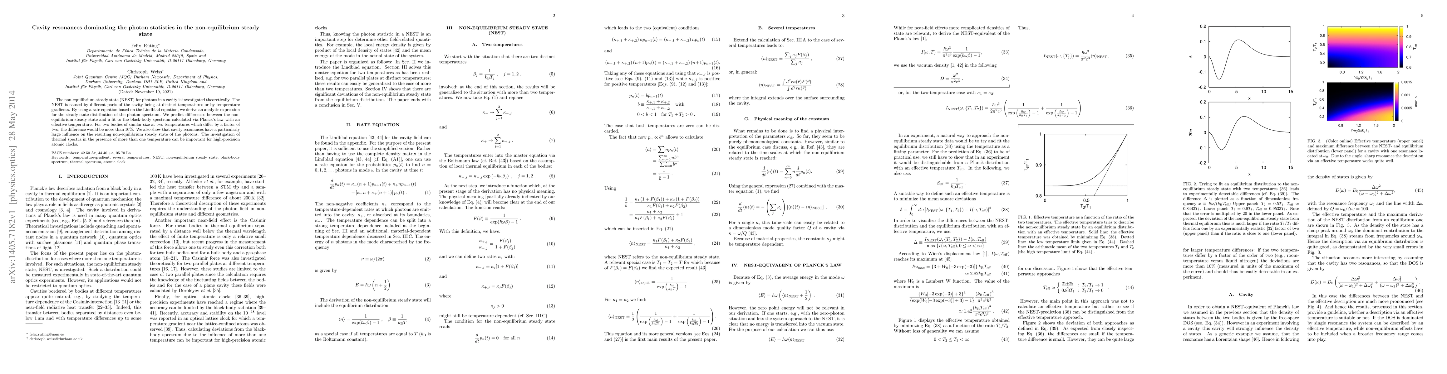 This paper investigates the non-equilibrium steady state (NEST) for photons in a cavity, showing that cavity resonances significantly affect the photon statistics. The study predicts a more than 10% difference between the non-equilibrium steady state and a black-body spectrum fit, highlighting the importance of thermal spectra in high-precision atomic clocks.