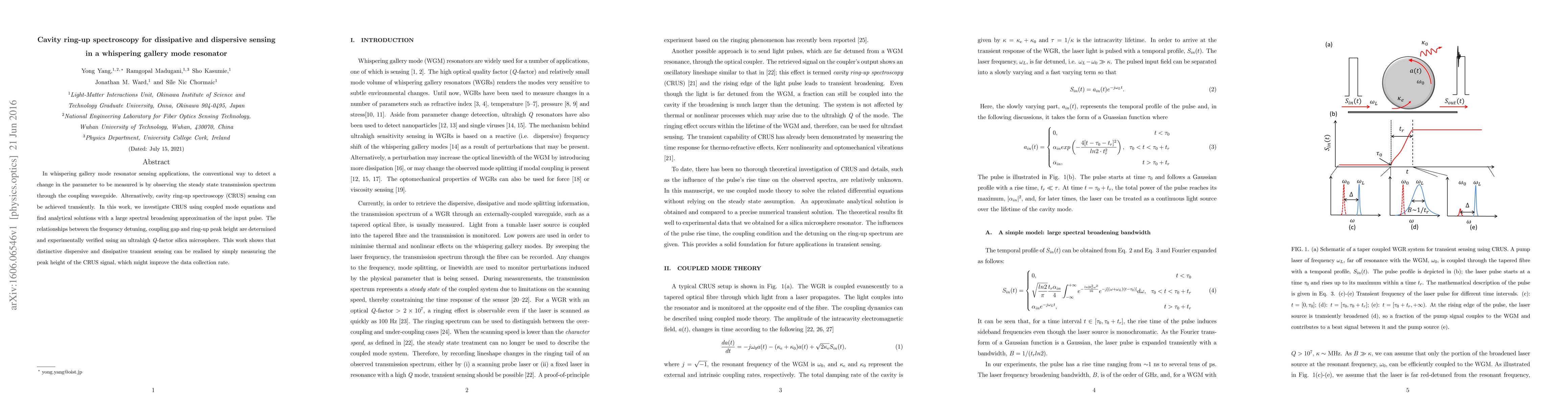 In whispering gallery mode resonator sensing applications, the conventional way to detect a change in the parameter to be measured is by observing the steady state transmission spectrum through the coupling waveguide. Alternatively, cavity ring-up spectroscopy (CRUS) sensing can be achieved transiently. In this work, we investigate CRUS using coupled mode equations and find analytical solutions with a large spectral broadening approximation of the input pulse. The relationships between the frequency detuning, coupling gap and ring-up peak height are determined and experimentally verified using an ultrahigh \textit{Q}-factor silica microsphere. This work shows that distinctive dispersive and dissipative transient sensing can be realised by simply measuring the peak height of the CRUS signal, which might improve the data collection rate.