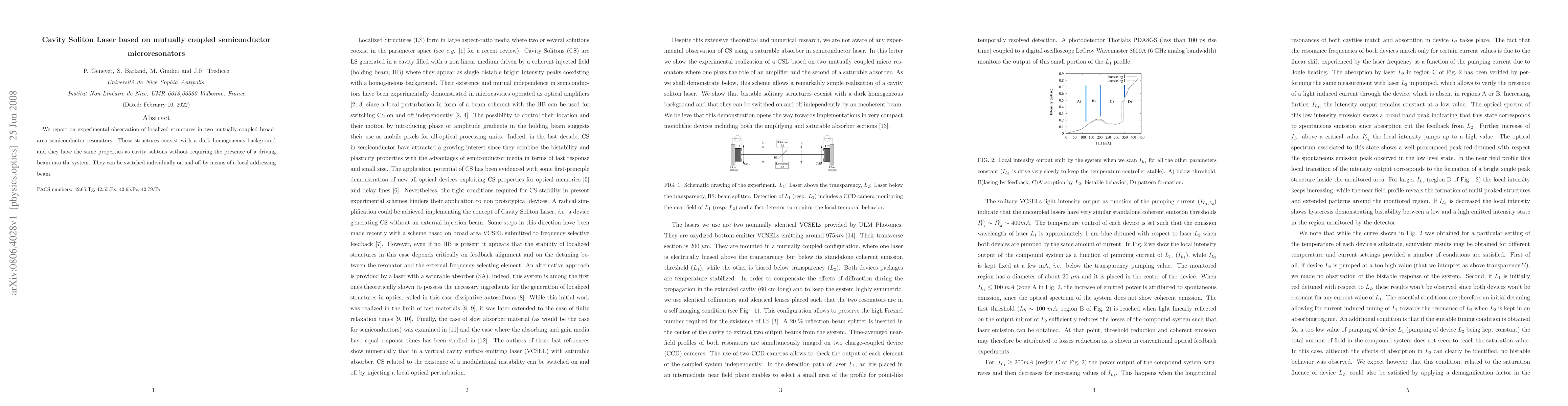 We report on experimental observation of localized structures in two mutually coupled broad-areahttp://hal.archives-ouvertes.fr/images/calendar.gif semiconductor resonators. These structures coexist with a dark homogeneous background and they have the same properties as cavity solitons without requiring the presence of a driving beam into the system. They can be switched individually on and off by means of a local addressing beam.