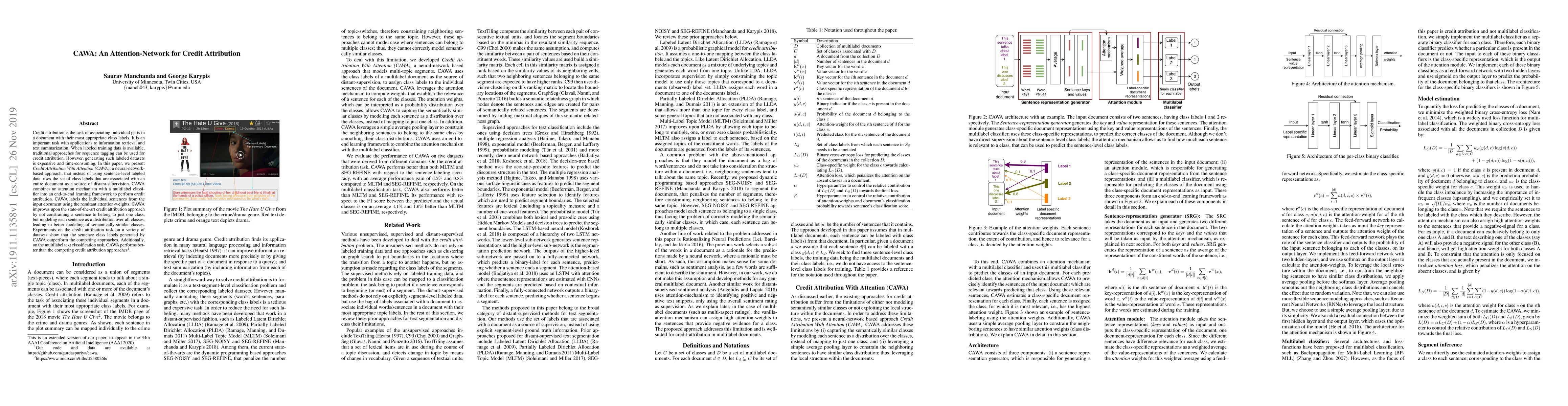 Credit attribution is the task of associating individual parts in a document with their most appropriate class labels. It is an important task with applications to information retrieval and text summarization. When labeled training data is available, traditional approaches for sequence tagging can be used for credit attribution. However, generating such labeled datasets is expensive and time-consuming. In this paper, we present "Credit Attribution With Attention (CAWA)", a neural-network-based approach, that instead of using sentence-level labeled data, uses the set of class labels that are associated with an entire document as a source of distant-supervision. CAWA combines an attention mechanism with a multilabel classifier into an end-to-end learning framework to perform credit attribution. CAWA labels the individual sentences from the input document using the resultant attention-weights. CAWA improves upon the state-of-the-art credit attribution approach by not constraining a sentence to belong to just one class, but modeling each sentence as a distribution over all classes, leading to better modeling of semantically-similar classes. Experiments on the credit attribution task on a variety of datasets show that the sentence class labels generated by CAWA outperform the competing approaches. Additionally, on the multilabel text classification task, CAWA performs better than the competing credit attribution approaches.