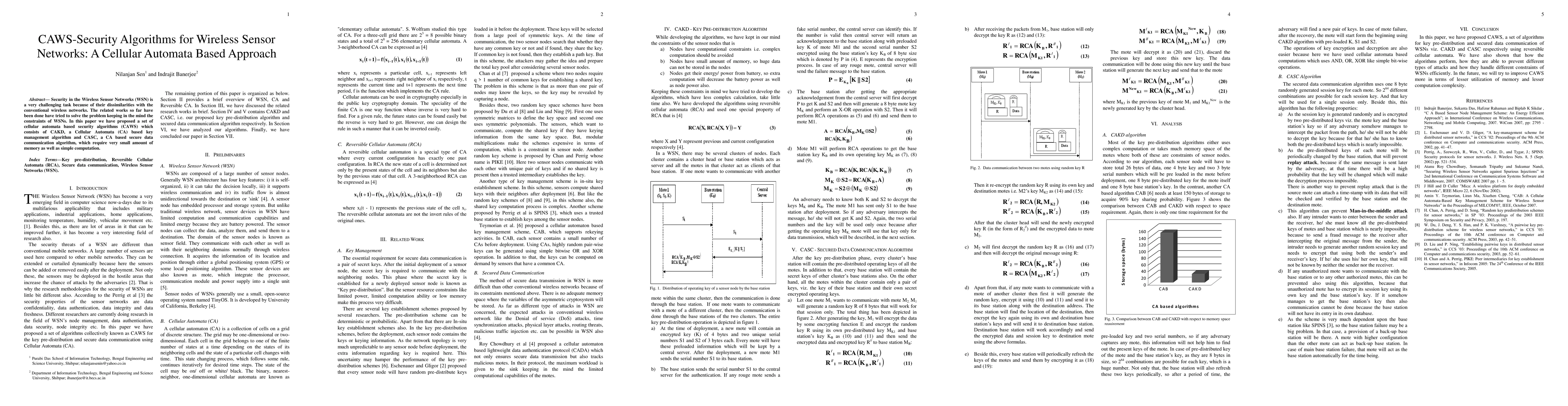 This paper proposes CAWS, a set of cellular automata based security algorithms for Wireless Sensor Networks, including CAKD for key management and CASC for secure data communication, designed to address WSN constraints with minimal memory and computational requirements.