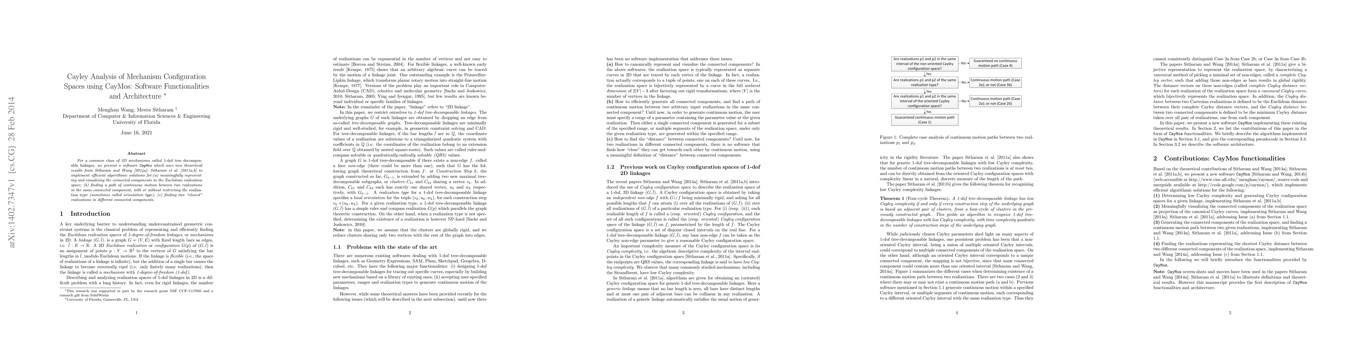 Summary: CayMos software utilizes novel theoretical results to efficiently represent and visualize the configuration spaces of 1-dof tree decomposable linkages, enabling path finding and identification of the closest realizations between connected components.