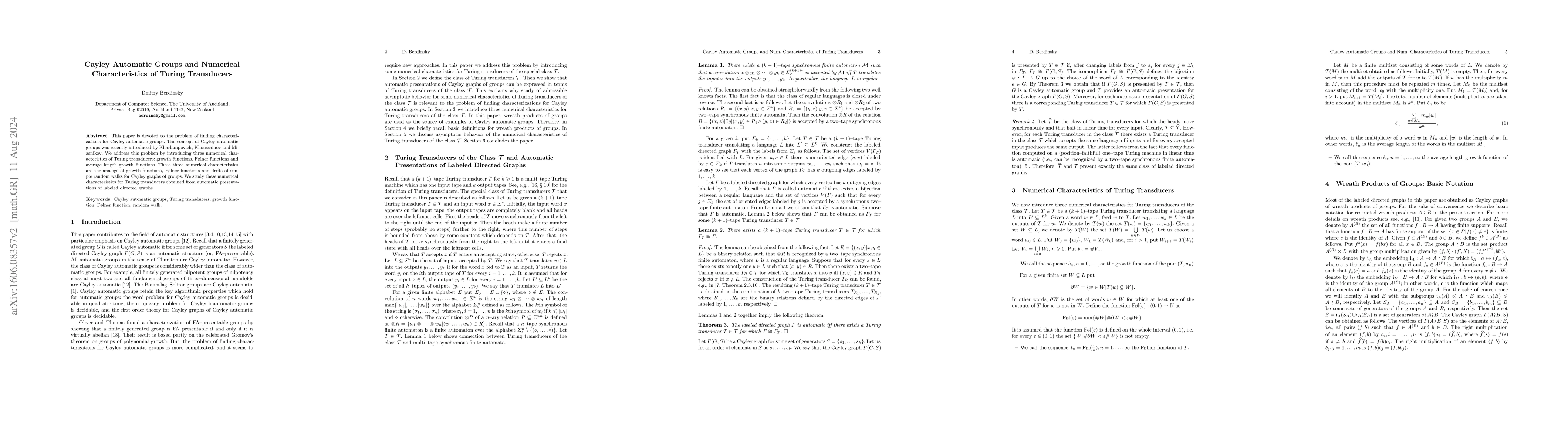 This paper is devoted to the problem of finding characterizations for Cayley automatic groups. The concept of Cayley automatic groups was recently introduced by Kharlampovich, Khoussainov and Miasnikov. We address this problem by introducing three numerical characteristics of Turing transducers: growth functions, Folner functions and average length growth functions. These three numerical characteristics are the analogs of growth functions, Folner functions and drifts of simple random walks for Cayley graphs of groups. We study these numerical characteristics for Turing transducers obtained from automatic presentations of labeled directed graphs.