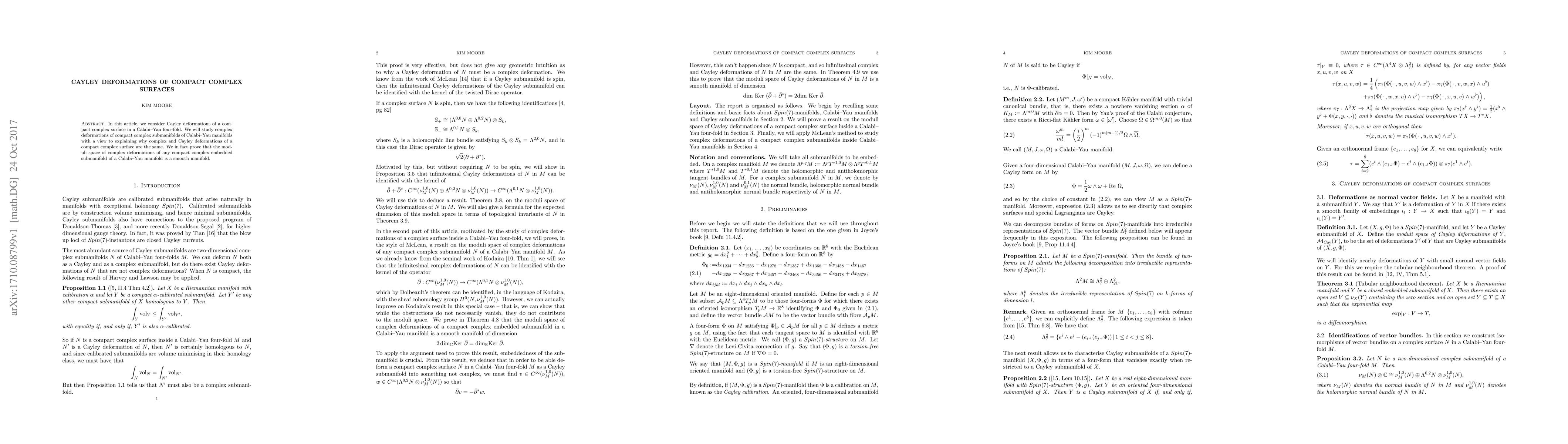 In this article, we consider Cayley deformations of a compact complex surface in a Calabi--Yau four-fold. We will study complex deformations of compact complex submanifolds of Calabi--Yau manifolds with a view to explaining why complex and Cayley deformations of a compact complex surface are the same. We in fact prove that the moduli space of complex deformations of any compact complex embedded submanifold of a Calabi--Yau manifold is a smooth manifold.