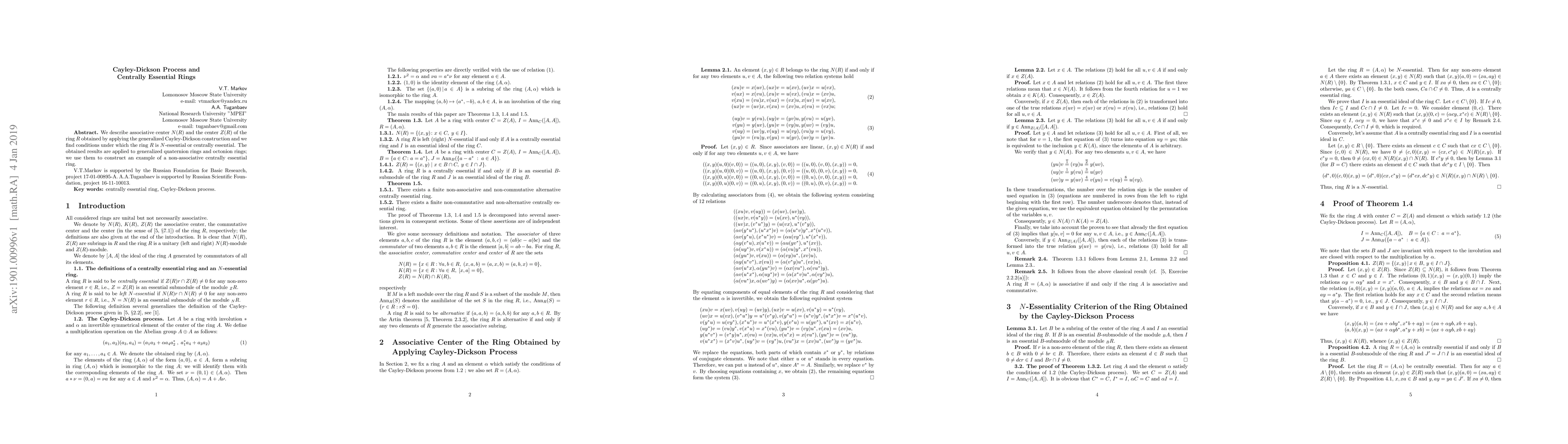 We describe associative center $N(R)$ and the center $Z(R)$ of the ring $R$ obtained by applying the generalized Cayley-Dickson construction and we find conditions under which the ring $R$ is $N$-essential or centrally essential. The obtained results are applied to generalized quaternion rings and octonion rings; we use them to construct an example of a non-associative centrally essential ring. Victor Markov is supported by the Russian Foundation for Basic Research, project 17-01-00895-A. Askar Tuganbaev is supported by Russian Scientific Foundation, project 16-11-10013.